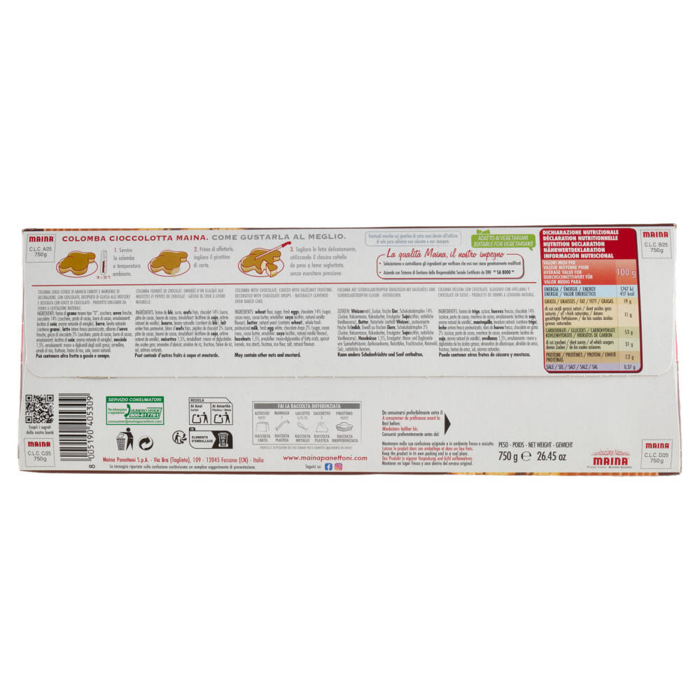 Soffice colomba, a lunga lievitazione naturale, ricca di cioccolato fondente nell'impasto e ricoperta da una croccante glassa di nocciole e gocce di cioccolato.