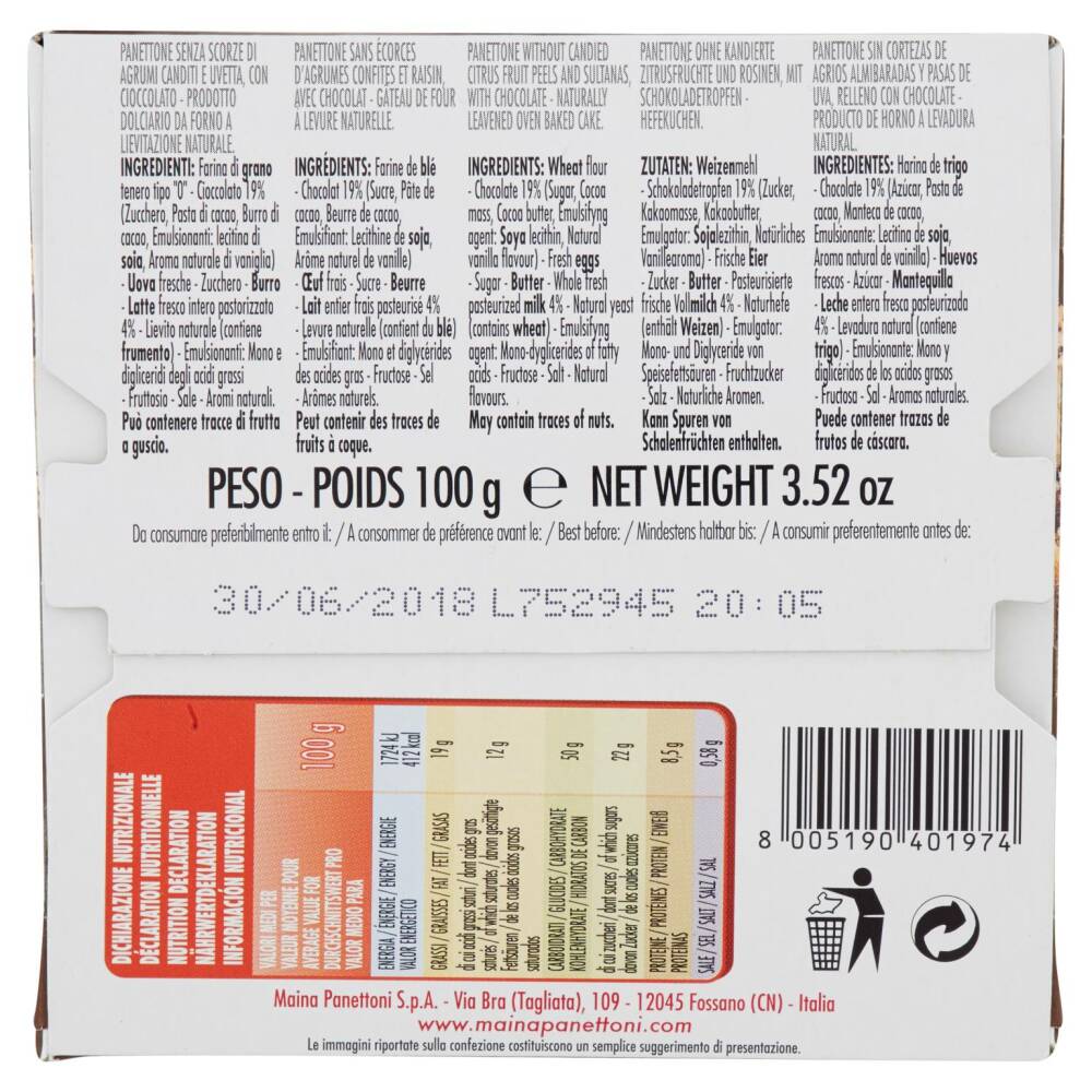 Farina di grano tenero tipo "0" Cioccolato 19% (zucchero, pasta di cacao, burro di cacao, emulsionanti: lecitina di soia, aroma naturale di vaniglia) Uova fresche Zucchero Burro Latte fresco intero pastorizzato 4% Lievito naturale (contiene frumento) Emulsionanti: mono e digliceridi degli acidi grassi Fruttosio Sale Aromi naturali Può contenere tracce di frutta a guscio