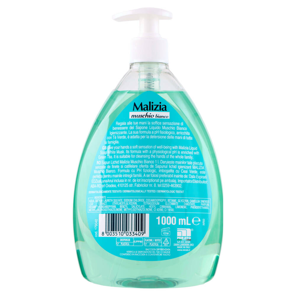Regala alle tue mani la soffice sensazione di benessere del Sapone Liquido Muschio Bianco Igienizzante. La sua formula a pH fisiologico, arricchita con Tè Verde, è adatta per la detersione delle mani di tutta la famiglia.