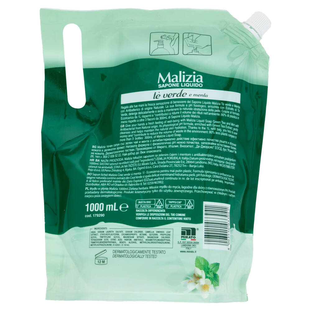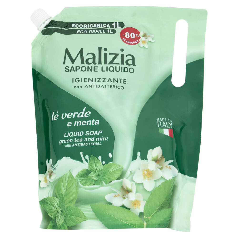 Regala alle tue mani la fresca sensazione di benessere del Sapone Liquido Malizia Tè verde e Menta con Antibatterico di origine Naturale. La sua formula a pH fisiologico, arricchita con Estratto di Tè Verde, deterge delicatamente e aiuta a mantenere la naturale idratazione della pelle. Grazie al formato Ecoricarica da 1L risparmi e *contribuisci a ridurre il volume dei rifiuti nell'ambiente: 80% di plastica in meno rispetto a oltre 3 flaconi da 300mL di Sapone Liquido Malizia.