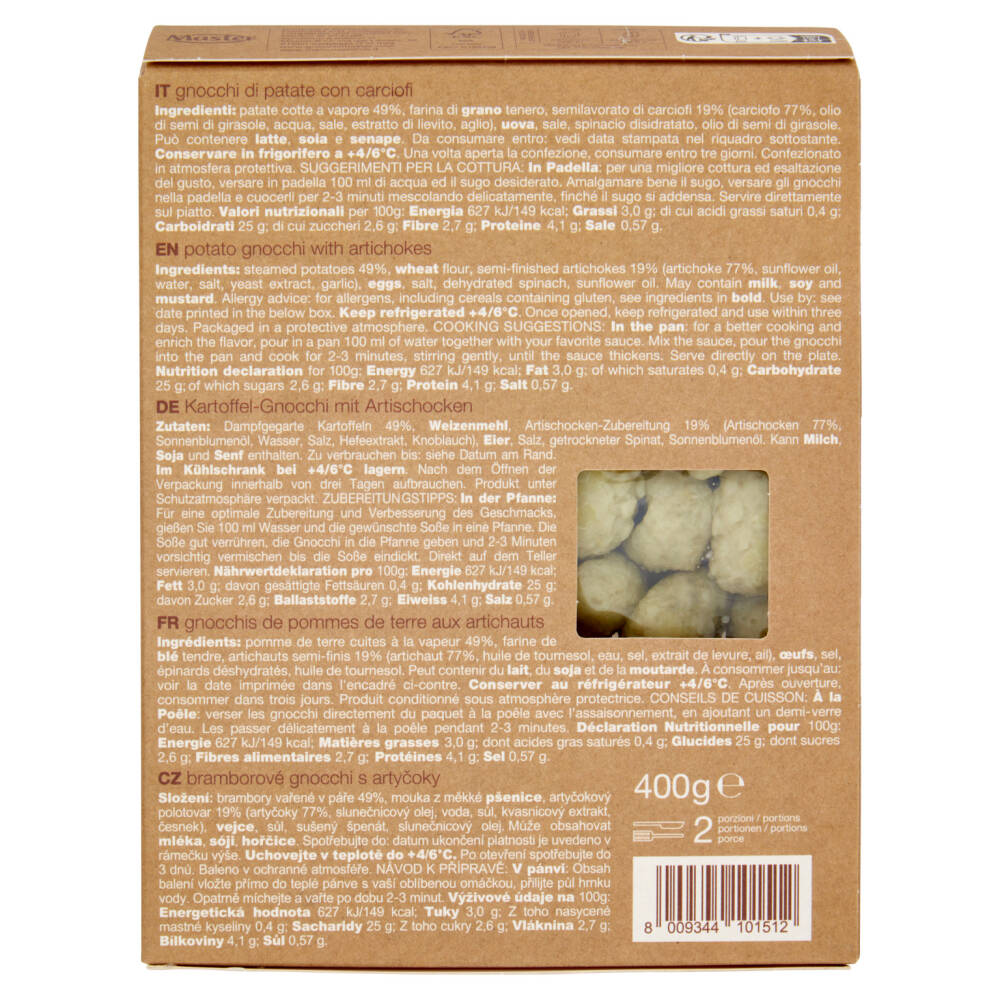 Patate cotte a vapore 49% Farina di grano tenero Semilavorato di carciofi 19% (carciofo 77%, olio di semi di girasole, acqua, sale, estratto di lievito, aglio) Uova Sale Spinacio disidratato Olio di semi di girasole Può contenere latte, soia e senape