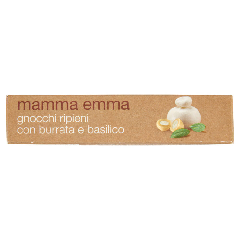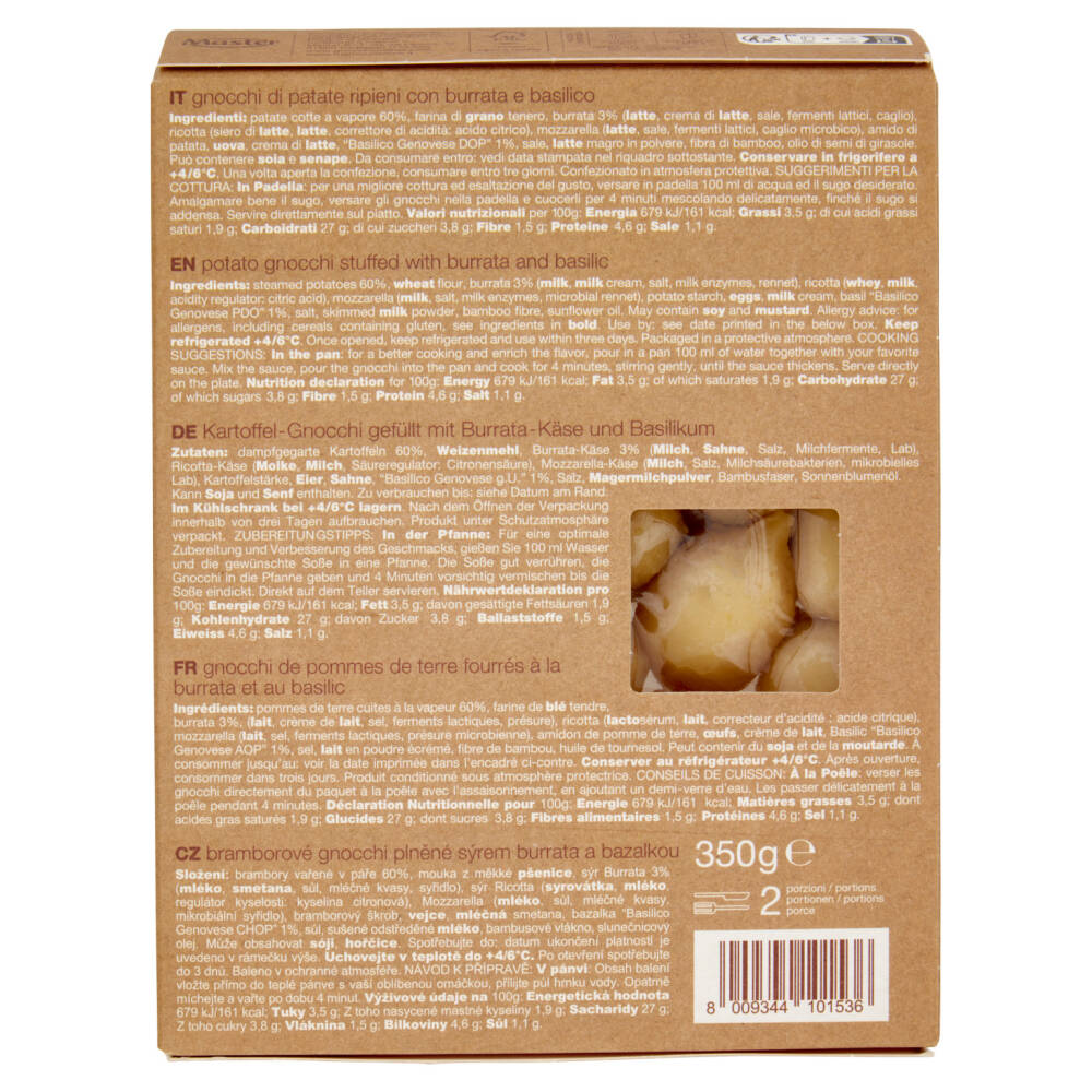 Patate cotte a vapore 60% Farina di grano tenero Burrata 3% (latte, crema di latte, sale, fermenti lattici, caglio) Ricotta (siero di latte, latte, correttore di acidità: acido citrico) Mozzarella (latte, sale, fermenti lattici, caglio microbico) Amido di patata Uova Crema di latte "Basilico Genovese DOP" 1% Sale Latte magro in polvere Fibra di bamboo Olio di semi di girasole Può contenere soia e senape