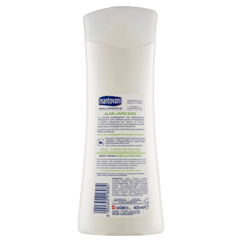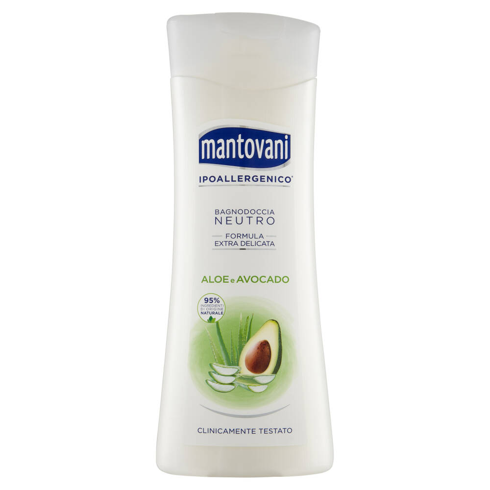 La formula Ipoallergenica del Bagnodoccia Mantovani è Extra Delicata grazie ad ingredienti e profumi selezionati per ridurre al minimo il rischio di sensibilizzazioni e per detergere la pelle idratandola e proteggendone l'equilibrio.