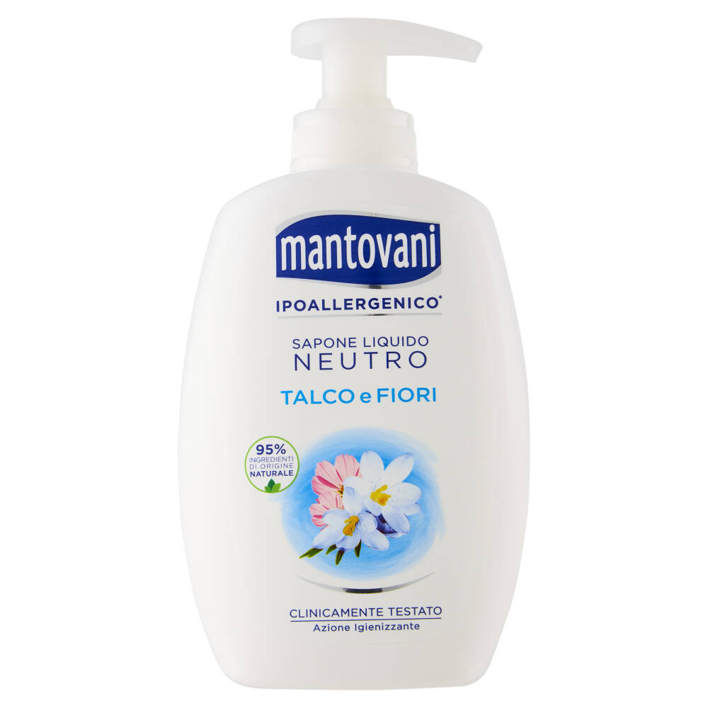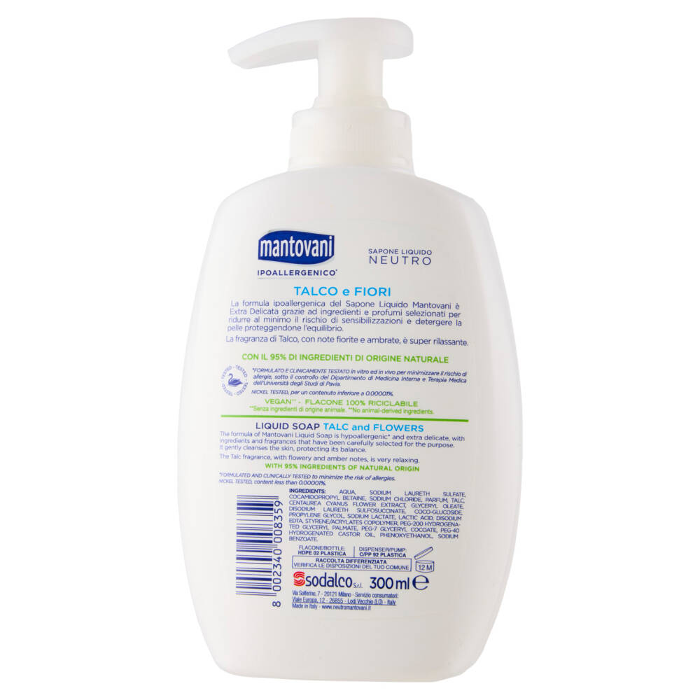 La formula ipoallergenica del Sapone Liquido Mantovani è Extra Delicata grazie ad ingredienti e profumi selezionati per ridurre al minimo il rischio di sensibilizzazioni e detergere la pelle proteggendone l'equilibrio.