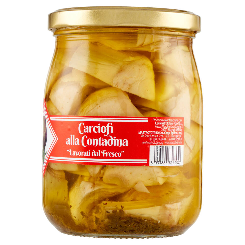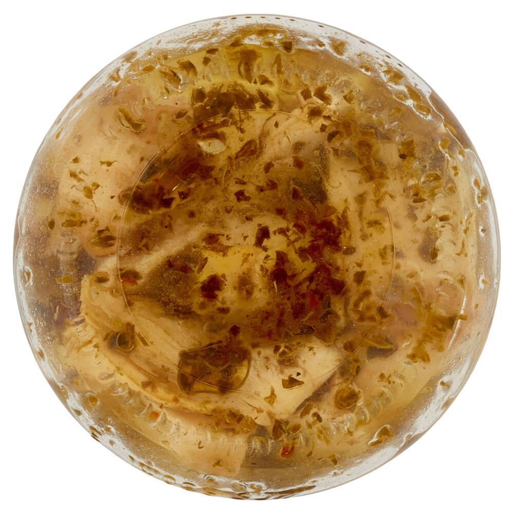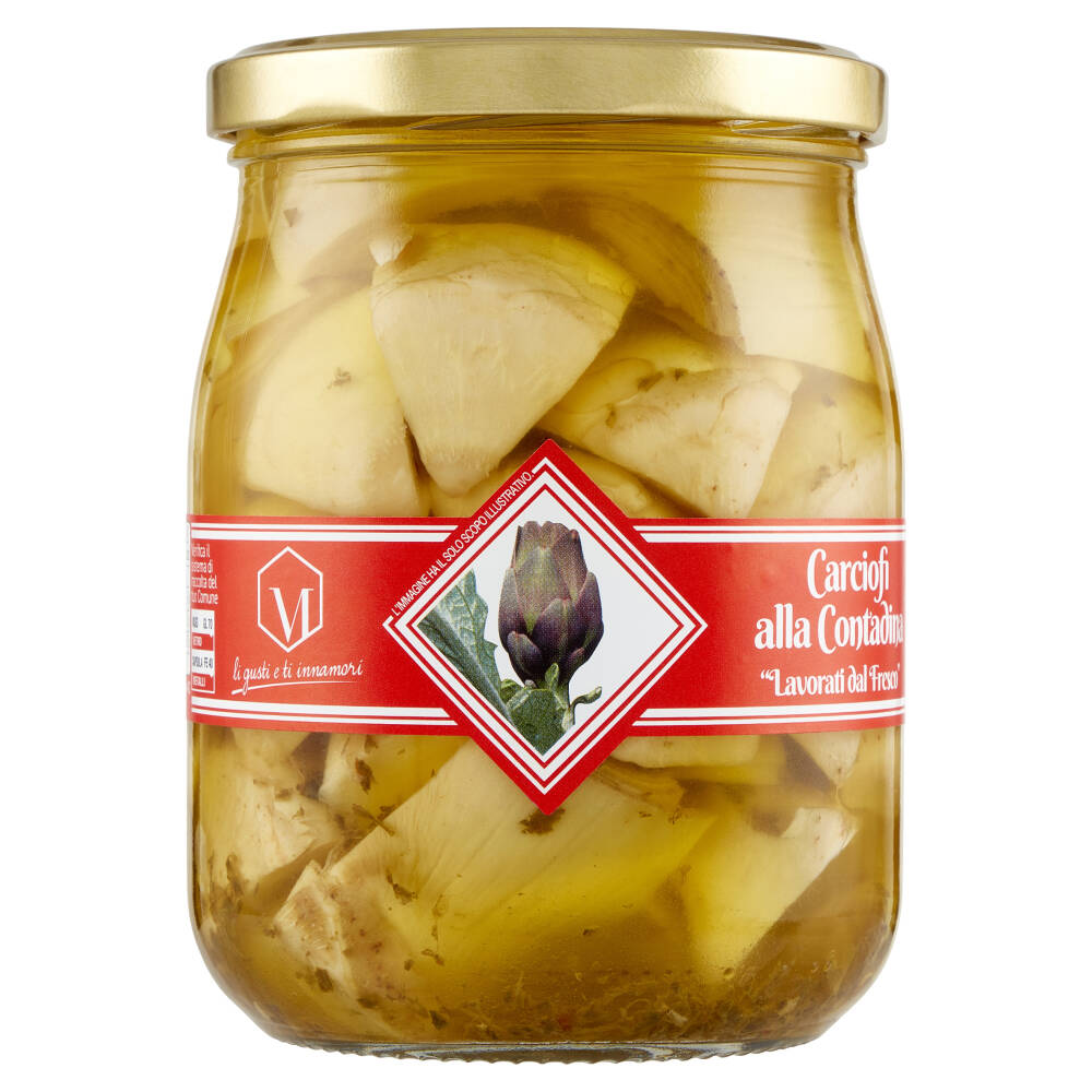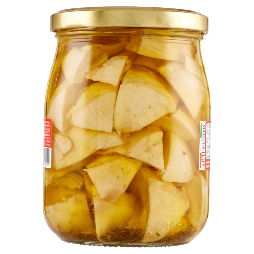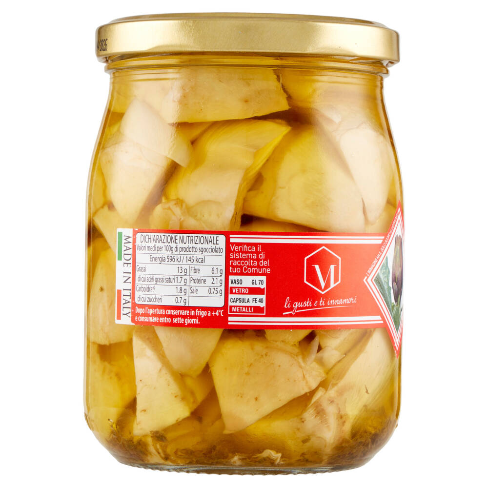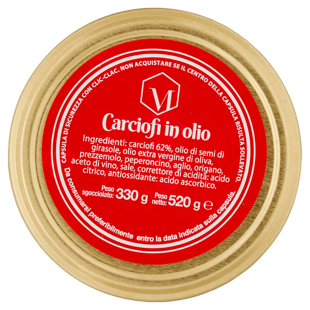 Carciofi 62% Olio di semi di girasole Olio extra vergine di oliva Prezzemolo Peperoncino Aglio Origano Aceto di vino Sale Correttore di acidità: acido citrico Antiossidante: acido ascorbico