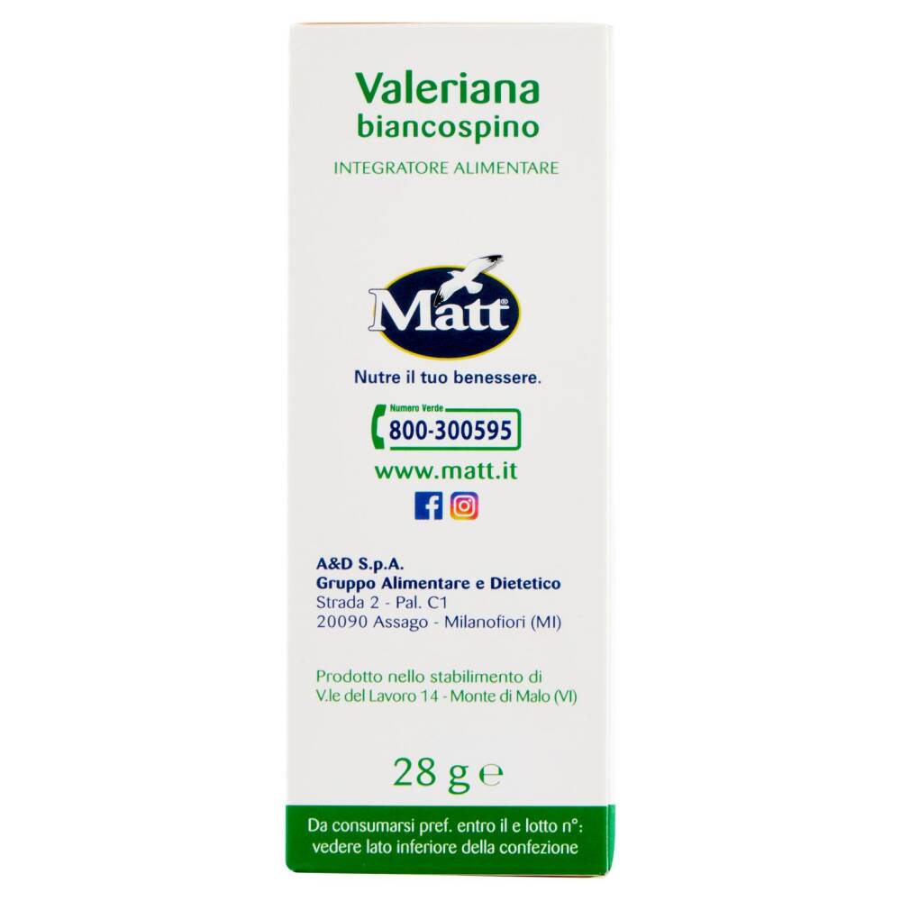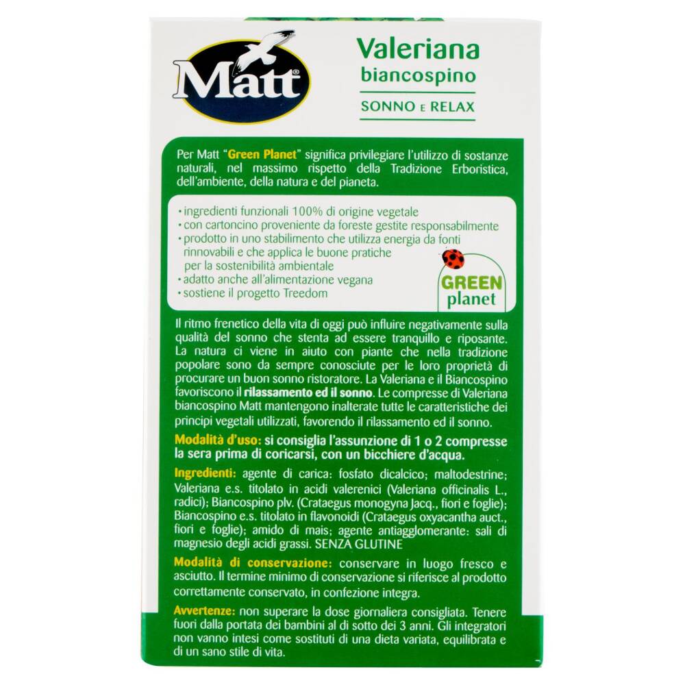 Il ritmo frenetico della vita di oggi può influire negativamente sulla qualità del sonno che stenta ad essere tranquillo e riposante. La natura ci viene in aiuto con piante che nella tradizione popolare sono da sempre conosciute per le loro proprietà di procurare un buon sonno ristoratore. La Valeriana e il Biancospino favoriscono il rilassamento ed il sonno. Le compresse di Valeriana biancospino Matt mantengono inalterate tutte le caratteristiche dei principi vegetali utilizzati, favorendo il rilassamento ed il sonno.