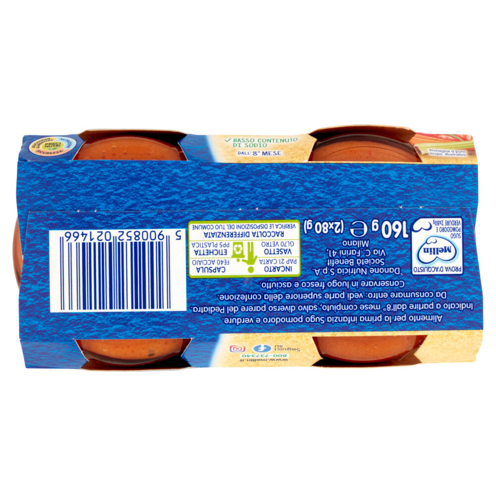 Alimento per la prima infanzia. Sugo pomodoro e verdure. Indicato a partire dall'8° mese compiuto, salvo diverso parere del Pediatria