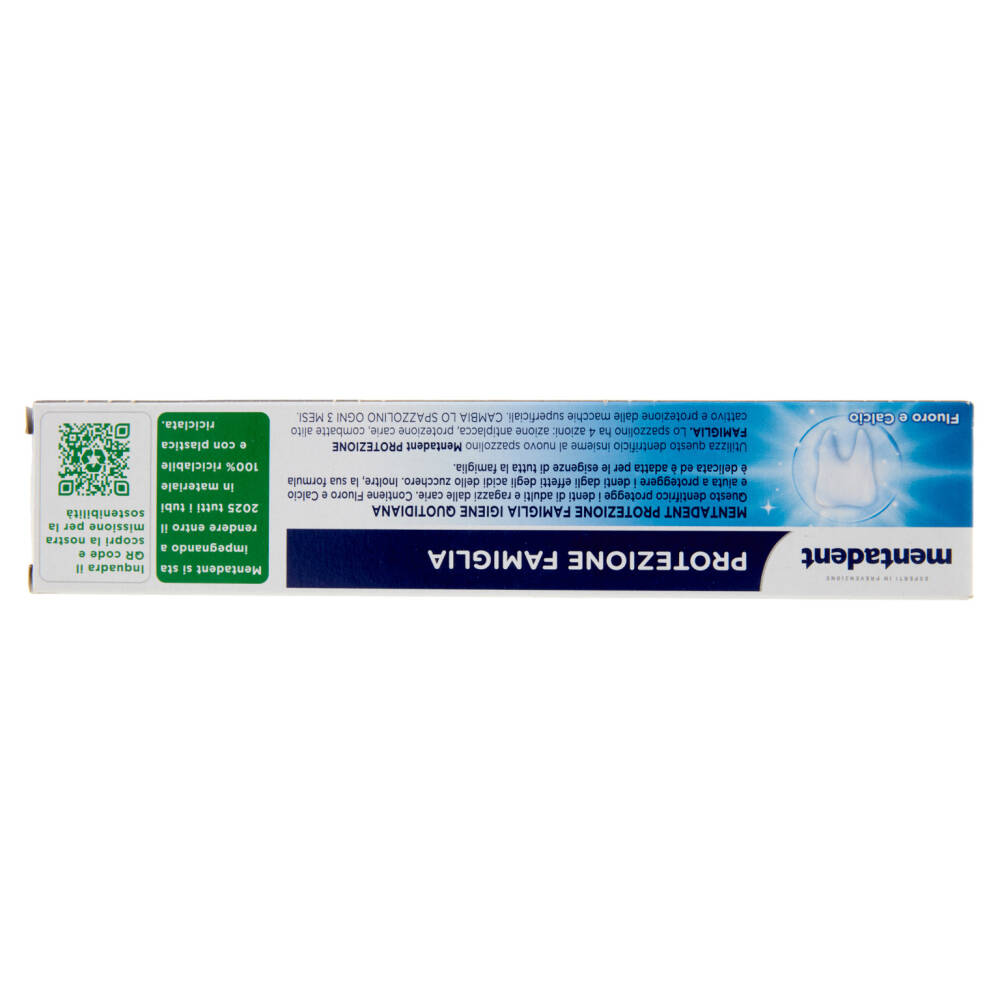 Utilizza questo dentrificio insieme al nuovo spazzolino Mentadent Protezione Famiglia. Lo spazzolino ha 4 azioni: azione antiplacca, protezione carie, combatte alito cattivo e protezione dalle macchie superficiali. Cambia lo spazzolino ogni 3 mesi.