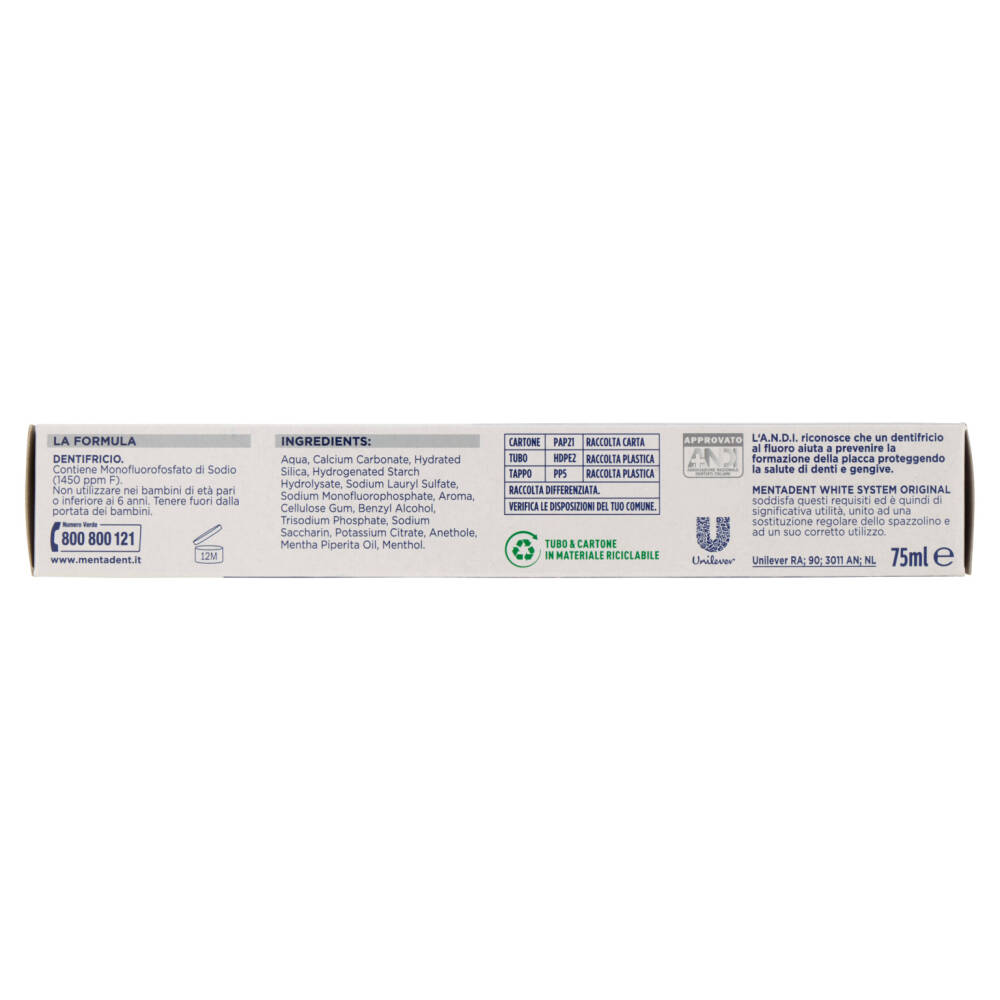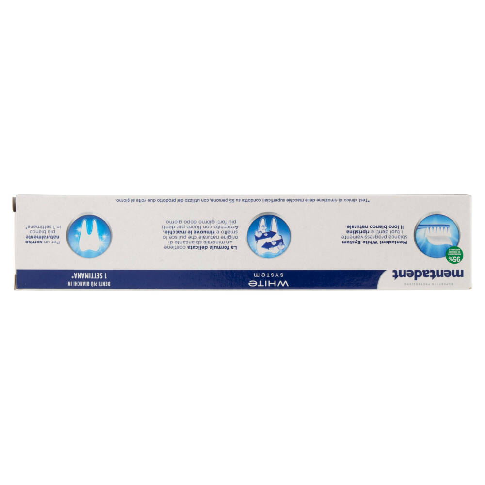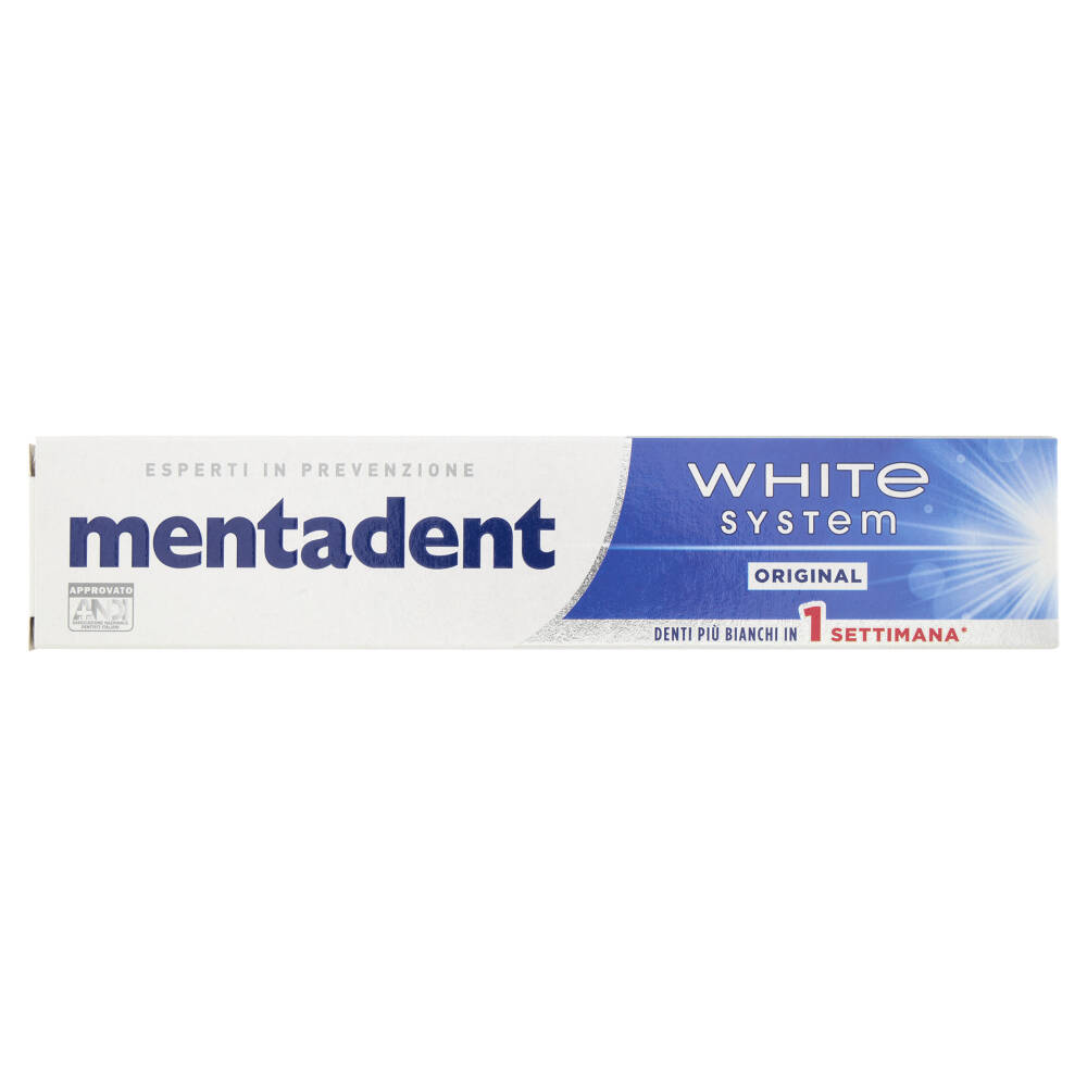 Mentadent White System Original soddisfa questi requisiti ed è quindi di significativa utilità, unito ad una sostituzione regolare dello spazzolino e ad un suo corretto utilizzo.
