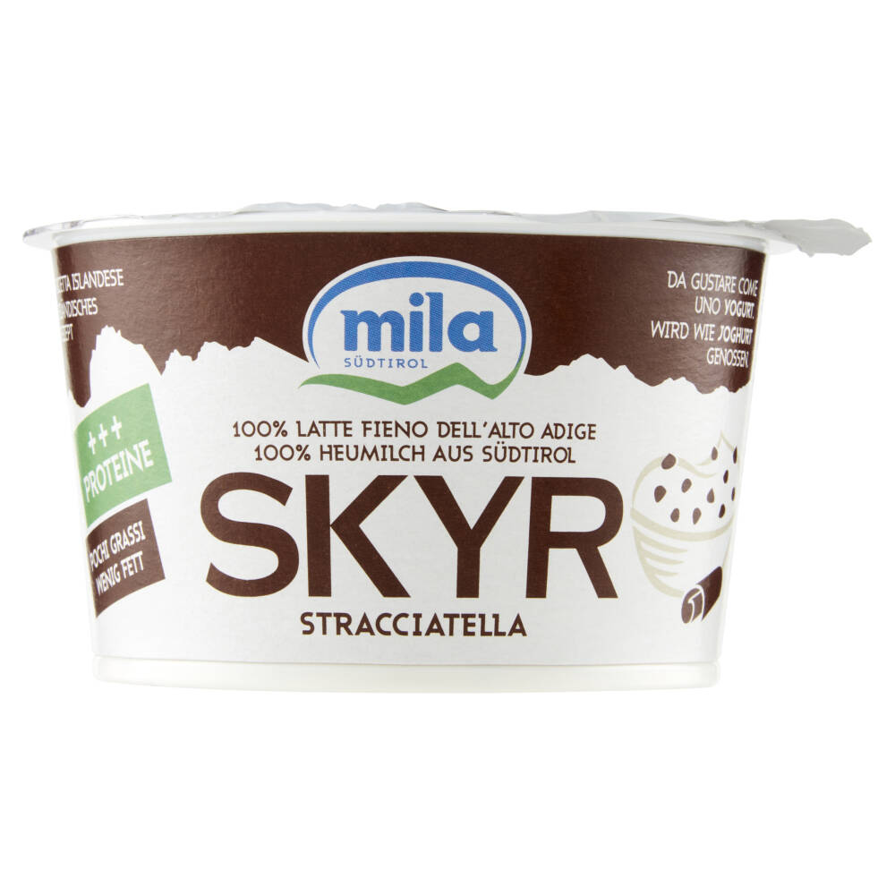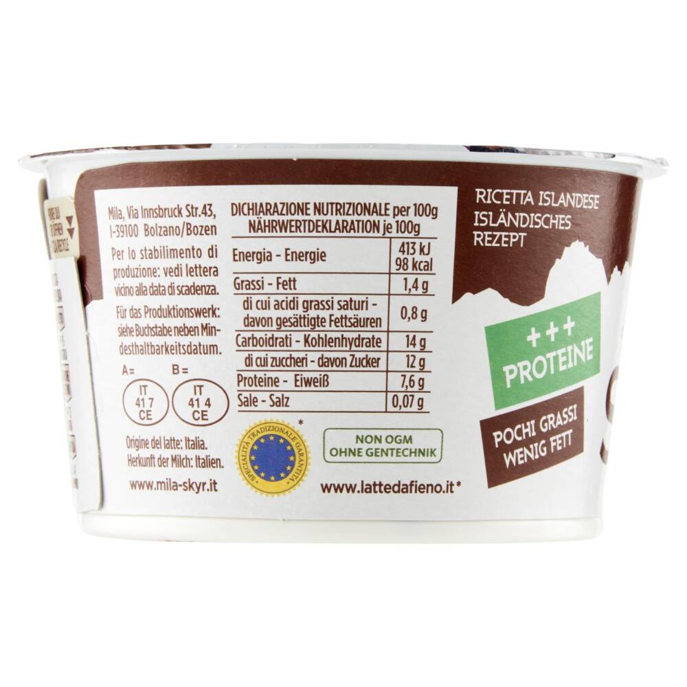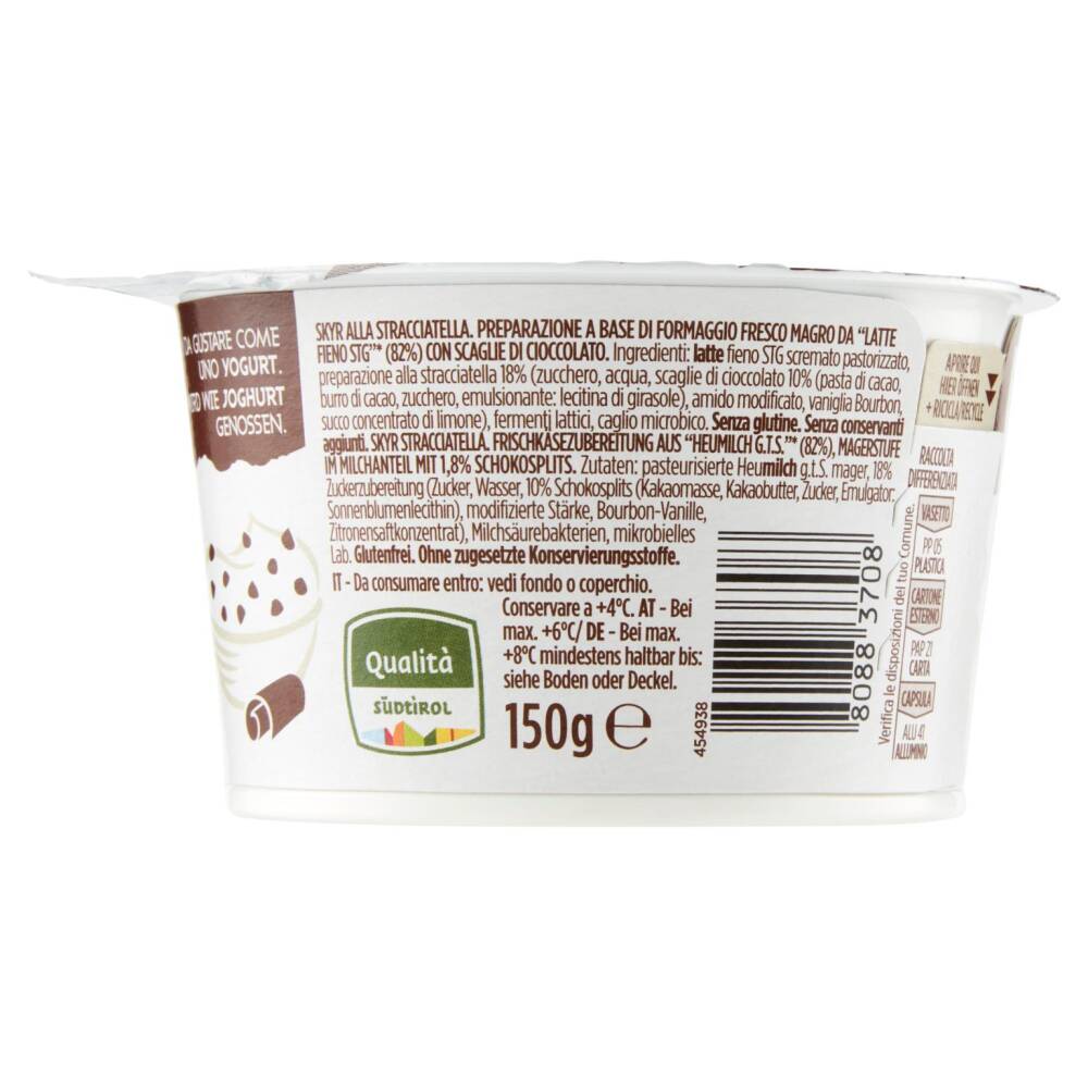 Skyr alla stracciatella. Preparazione a base di formaggio fresco magro da "Latte fieno STG"* (82%) con scaglie di cioccolato