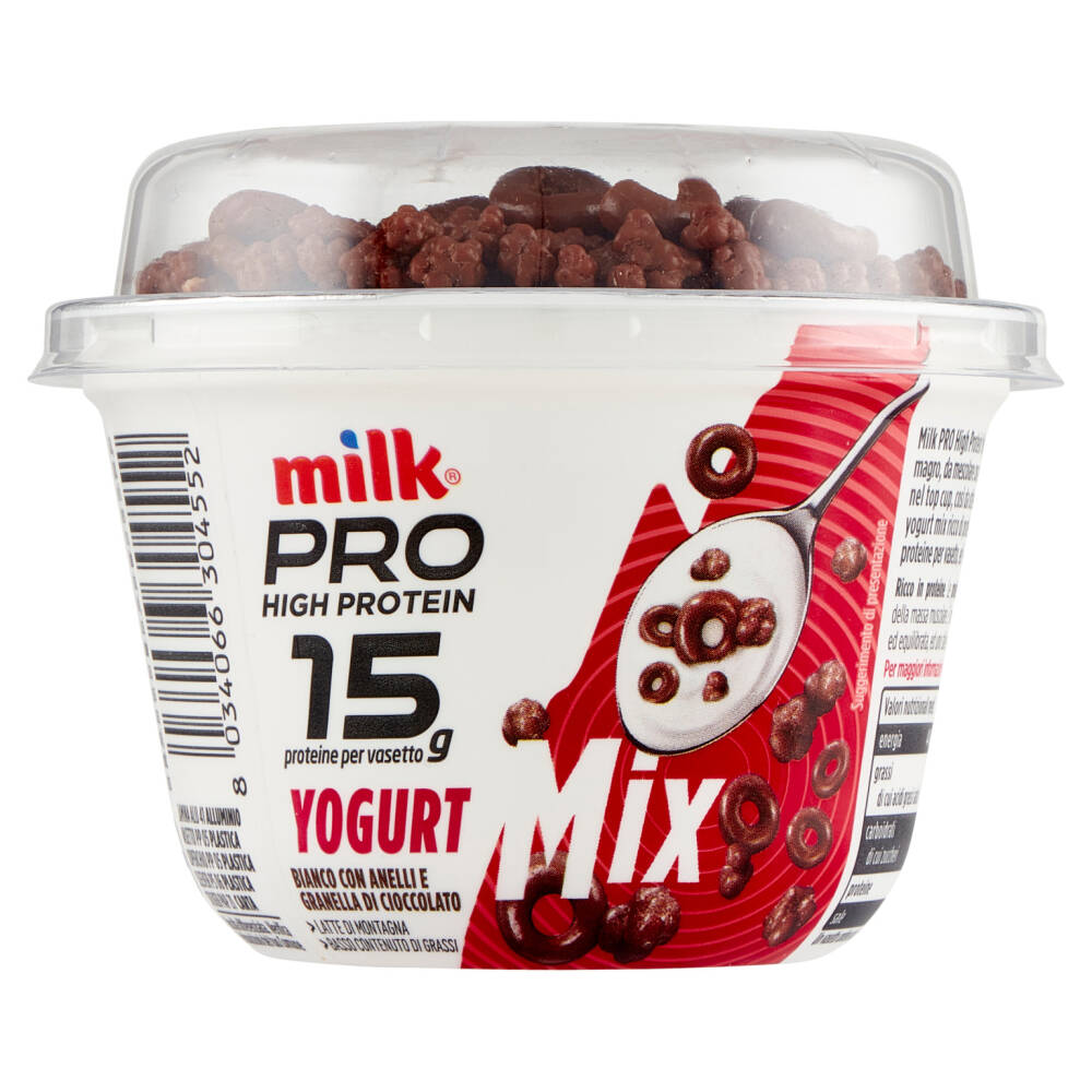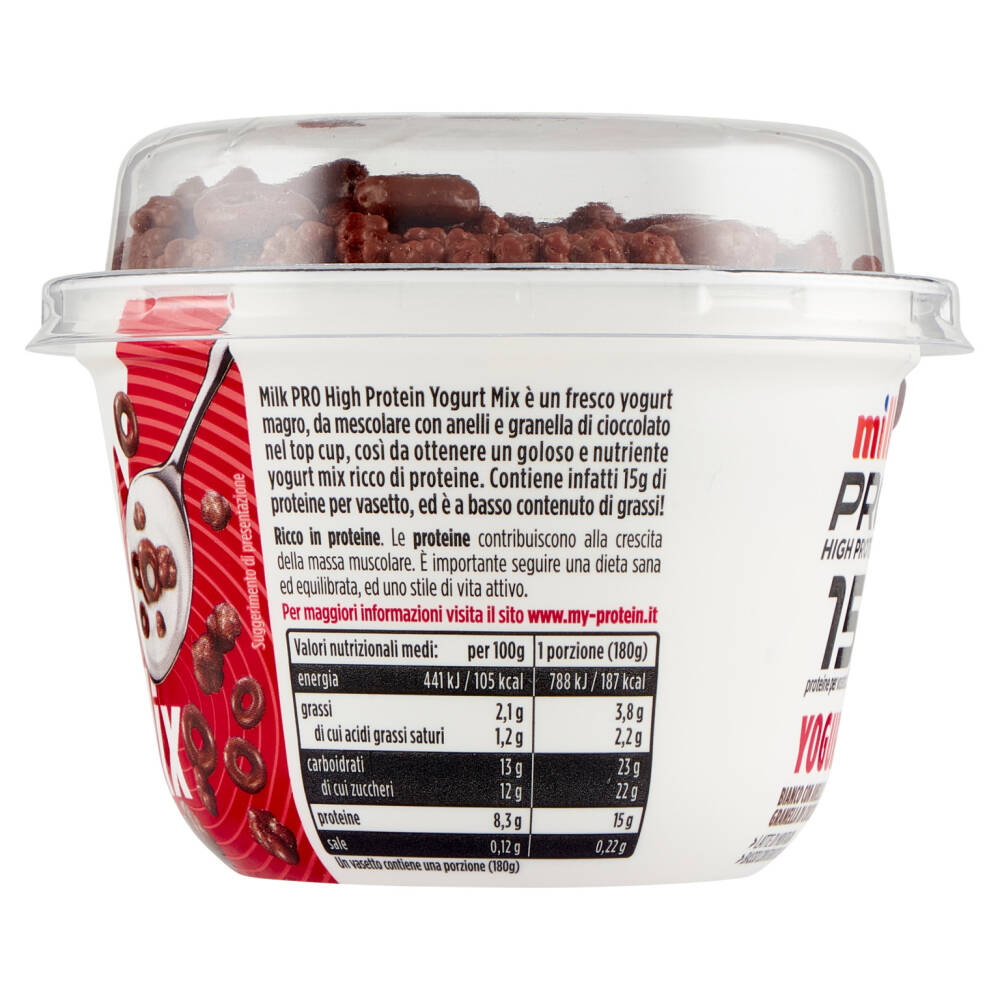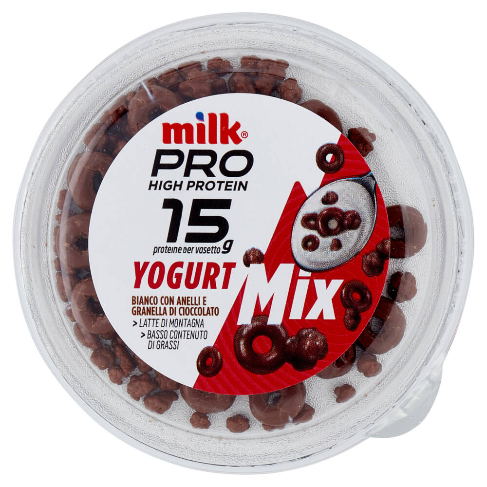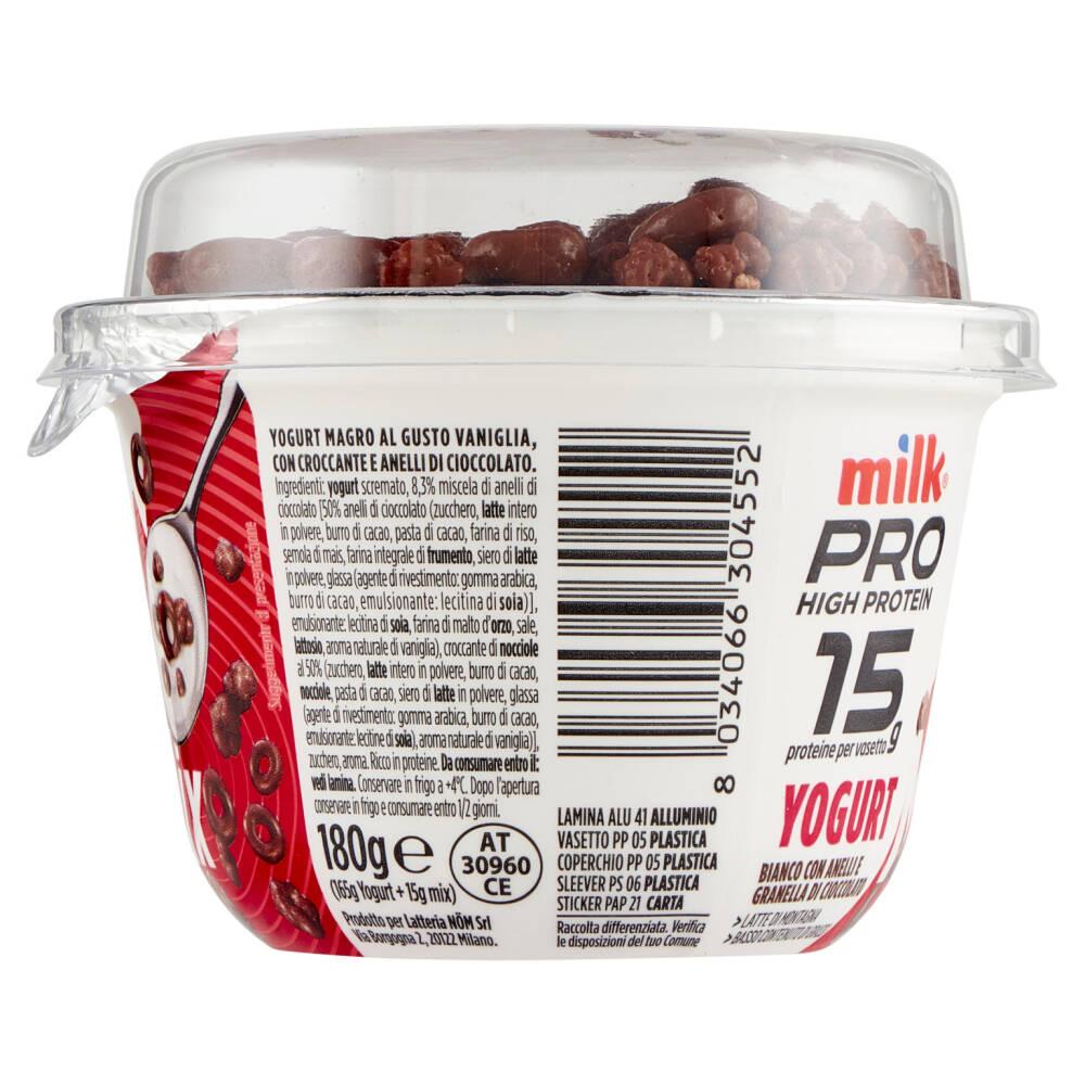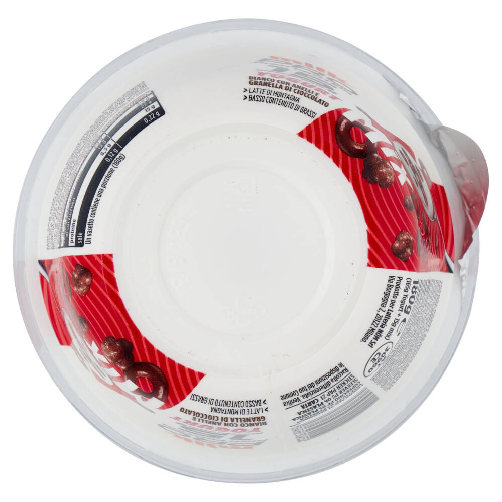 Yogurt scremato 8,3% miscela di anelli di cioccolato [50% anelli di cioccolato (zucchero, latte intero in polvere, burro di cacao, pasta di cacao, farina di riso, semola di mais, farina integrale di frumento, siero di latte in polvere, glassa (agente di rivestimento: gomma arabica, burro di cacao, emulsionante: lecitina di soia)], emulsionante: lecitina di soia, farina di malto d'orzo, sale, lattosio, aroma naturale di vaniglia)