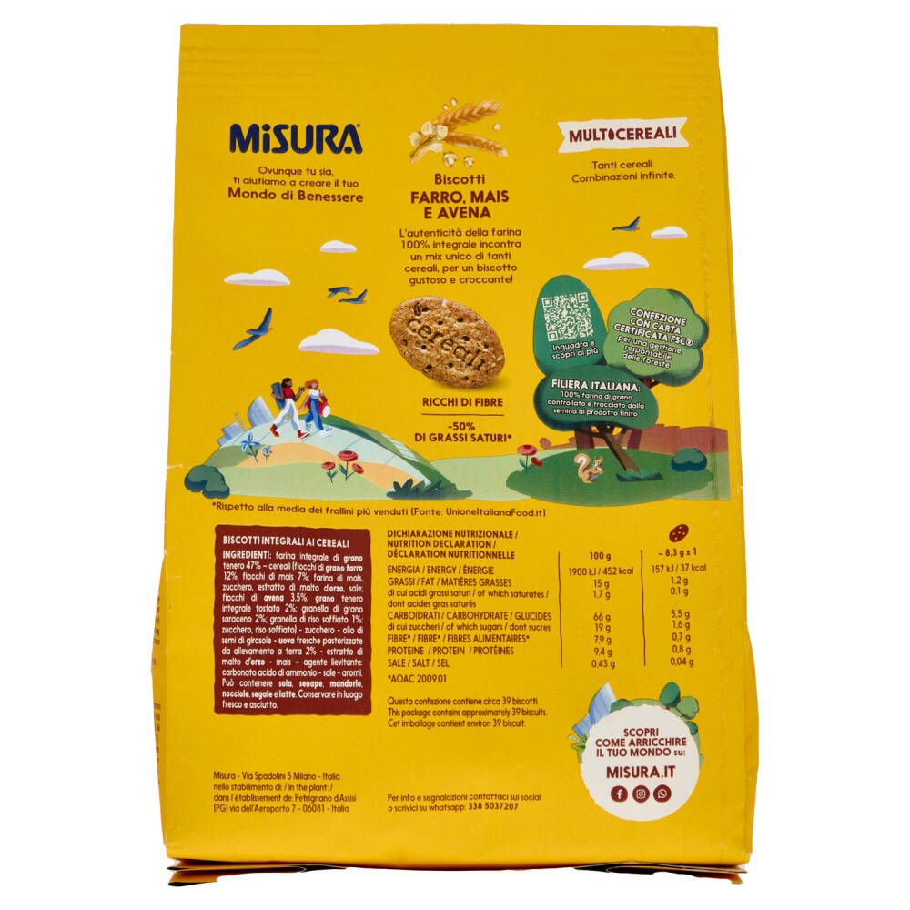 Cereali (fiocchi di grano farro 12%, fiocchi di mais 7%, farina di mais, zucchero, estratto di malto d'orzo, sale, fiocchi di avena 3,5%, grano tenero integrale tostato 2%, granella di grano saraceno 2%, granella di riso soffiato 1%, zucchero, riso soffiato)
