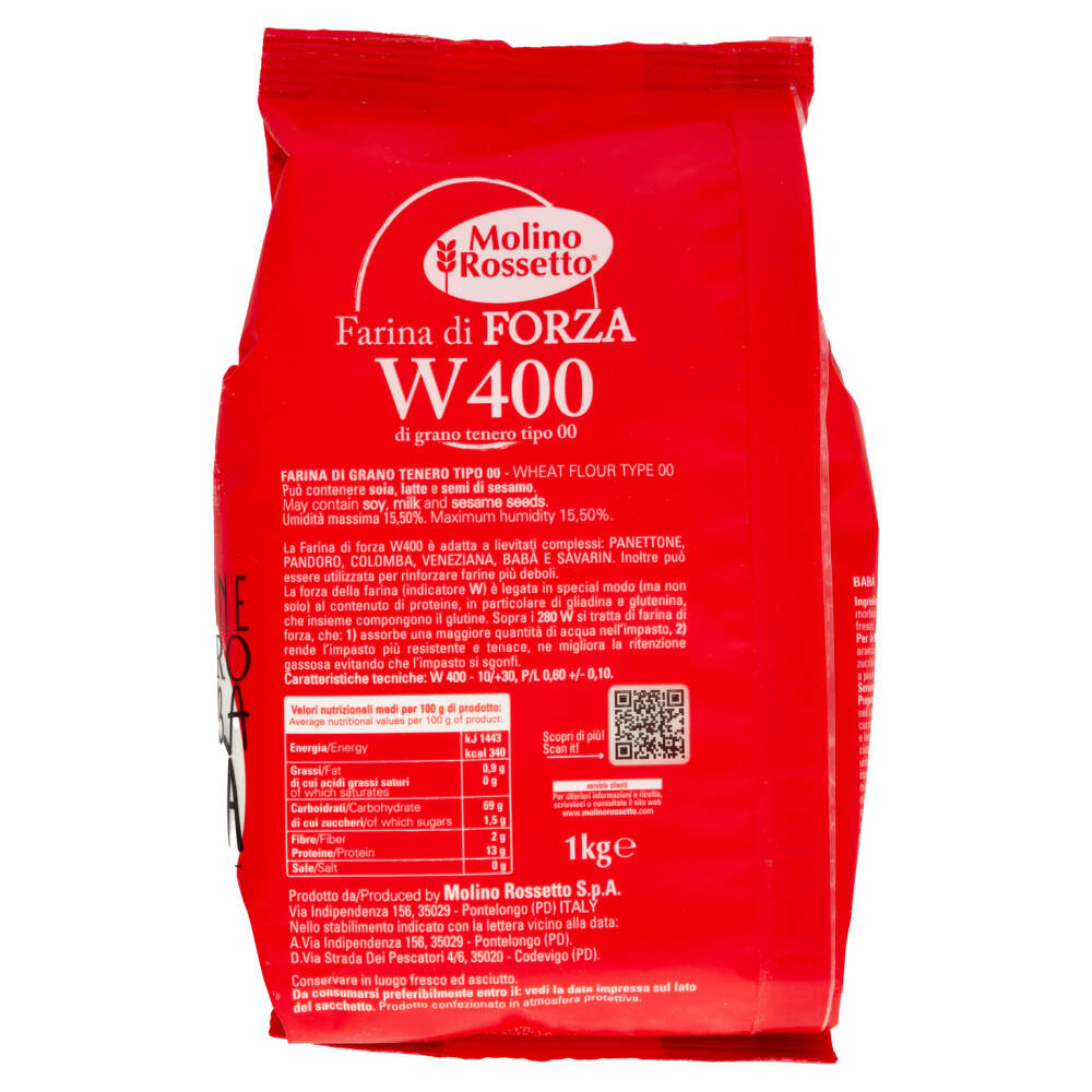 La Farina di forza W400 è adatta a lievitati complessi: Panettone, Pandoro, Colomba, Veneziana, Babà e Savarin. Inoltre può essere utilizzata per rinforzare farine più deboli.