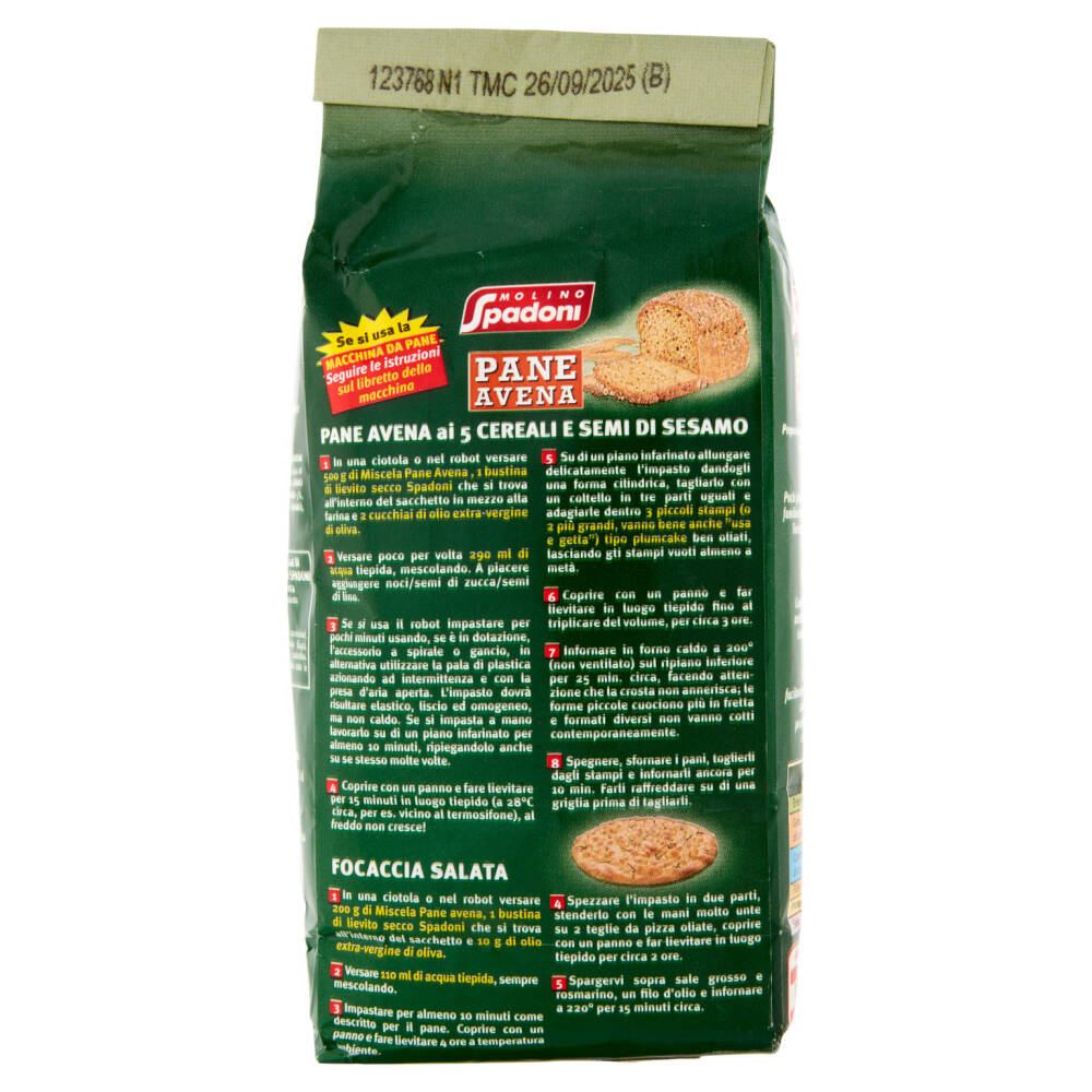 1 In una ciotola o nel robot versare 500 g di Miscela Pane Avena, 1 bustina di lievito secco Spadoni che si trova all'interno del sacchetto in mezzo alla farina e 2 cucchiai di olio extra-vergine di oliva.