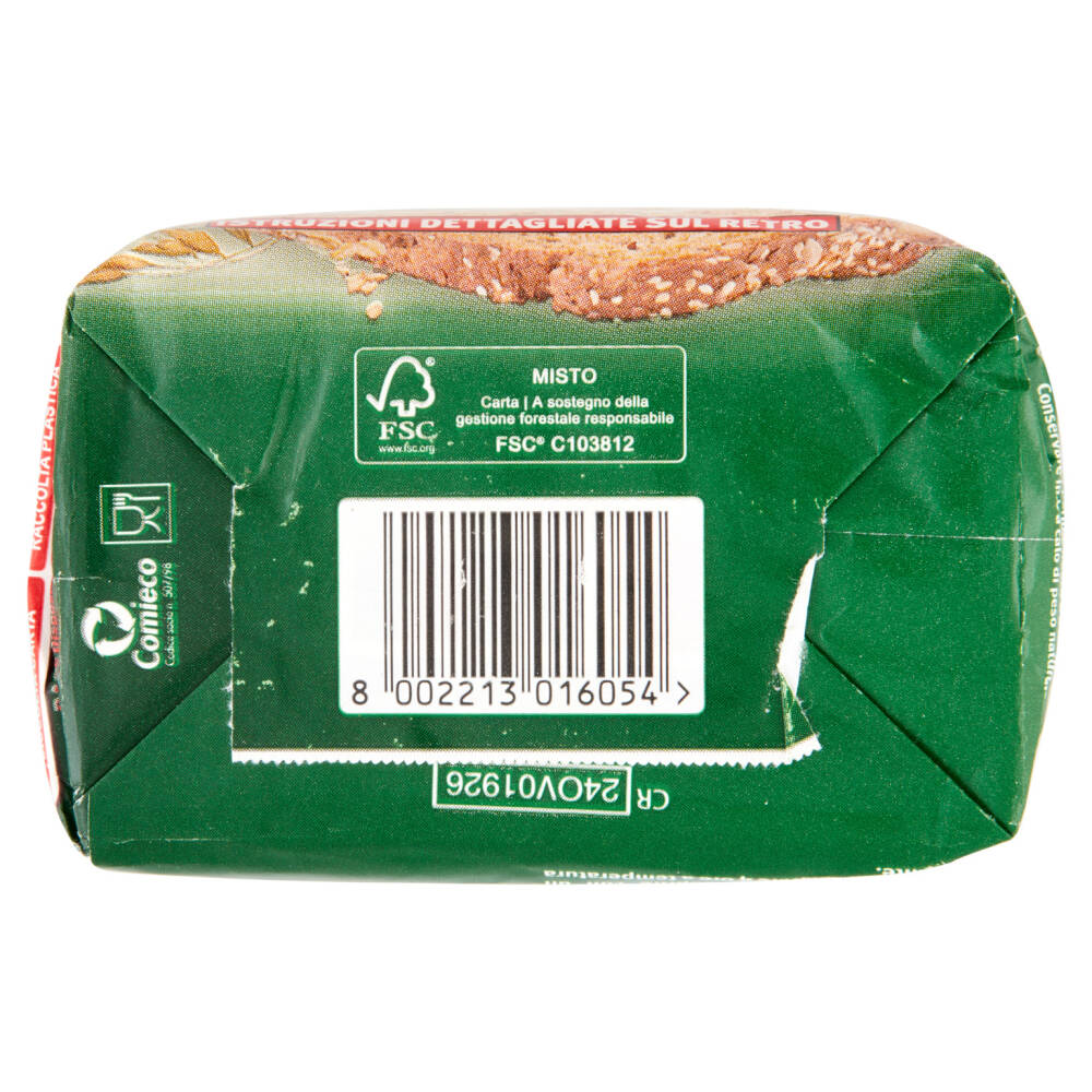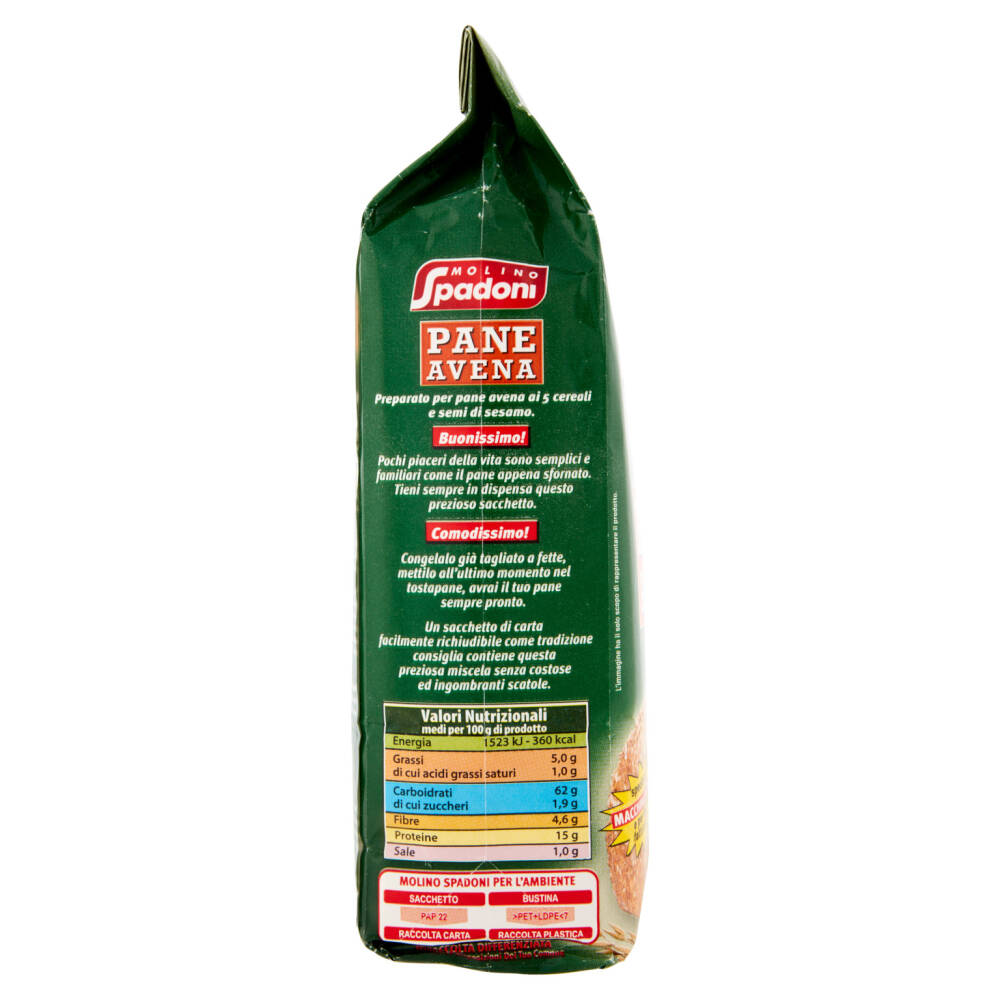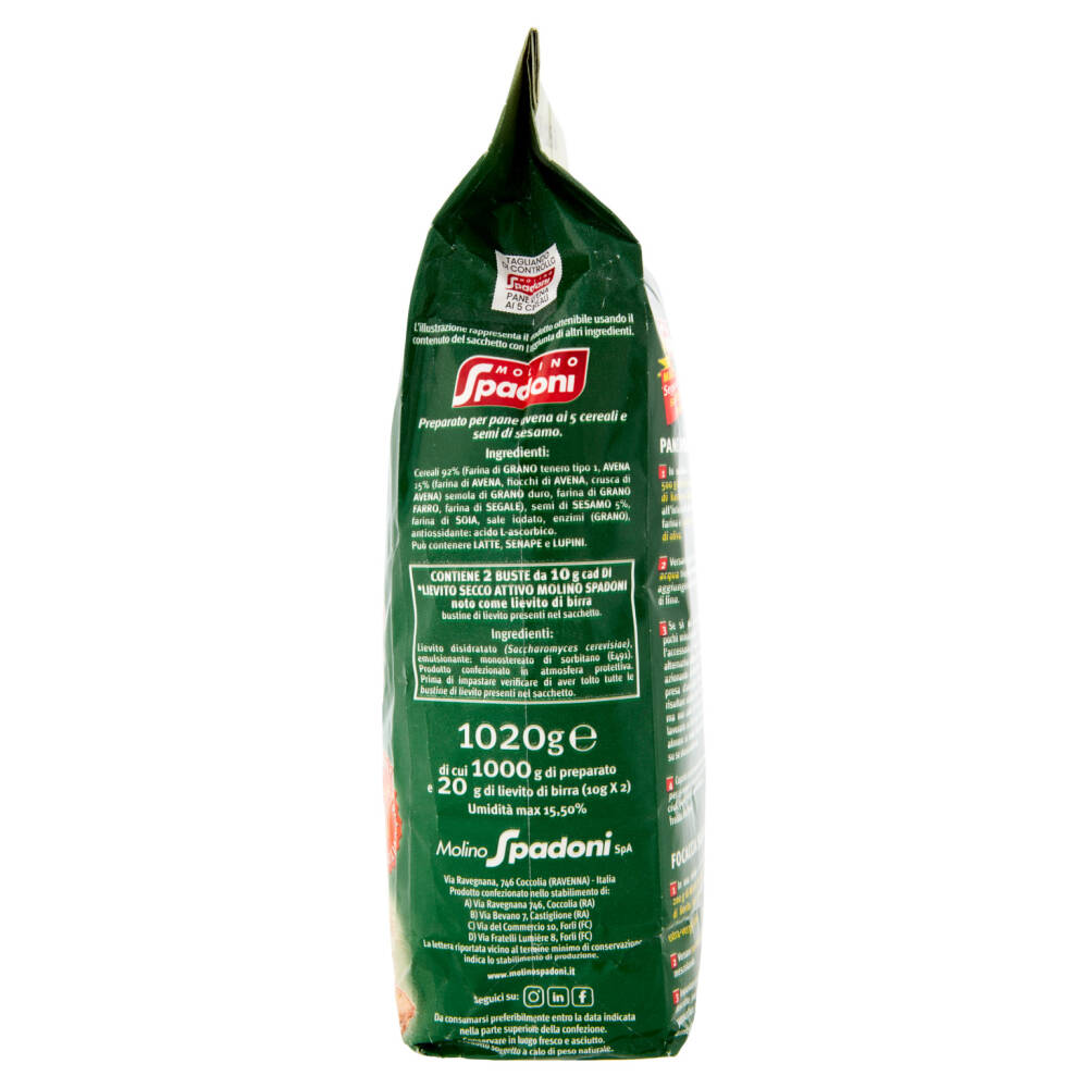 Cereali 92% (farina di grano tenero tipo 1, avena 15% (farina di avena, fiocchi di avena, crusca di avena), semola di grano duro, farina di grano farro, farina di segale) Semi di sesamo 5% Farina di soia Sale iodato Enzimi (grano) Antiossidante: acido L-ascorbico Può contenere latte, senape e lupini Contiene 2 buste da 10g cad di *lievito secco attivo Molino Spadoni noto come lievito di birra - Ingredienti: Lievito disidratato (Saccharomyces cerevisiae), emulsionante: monostereato di sorbitano (E491)