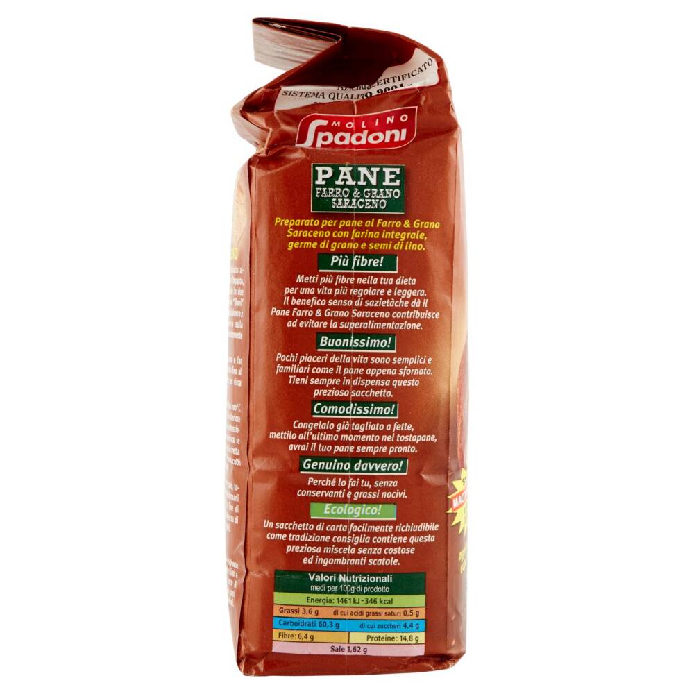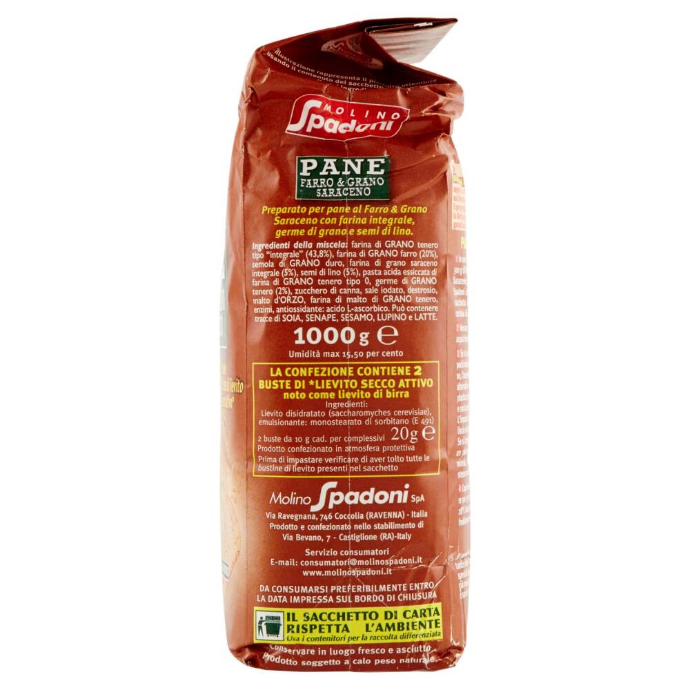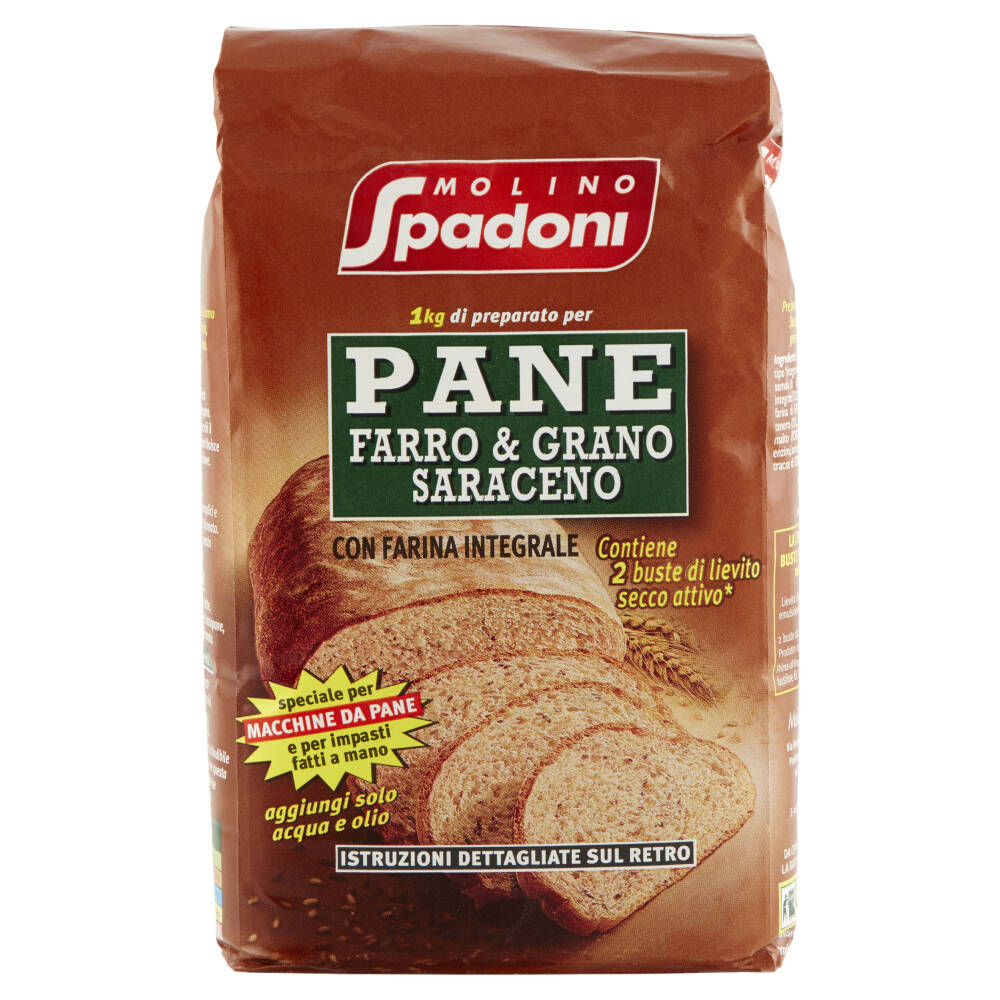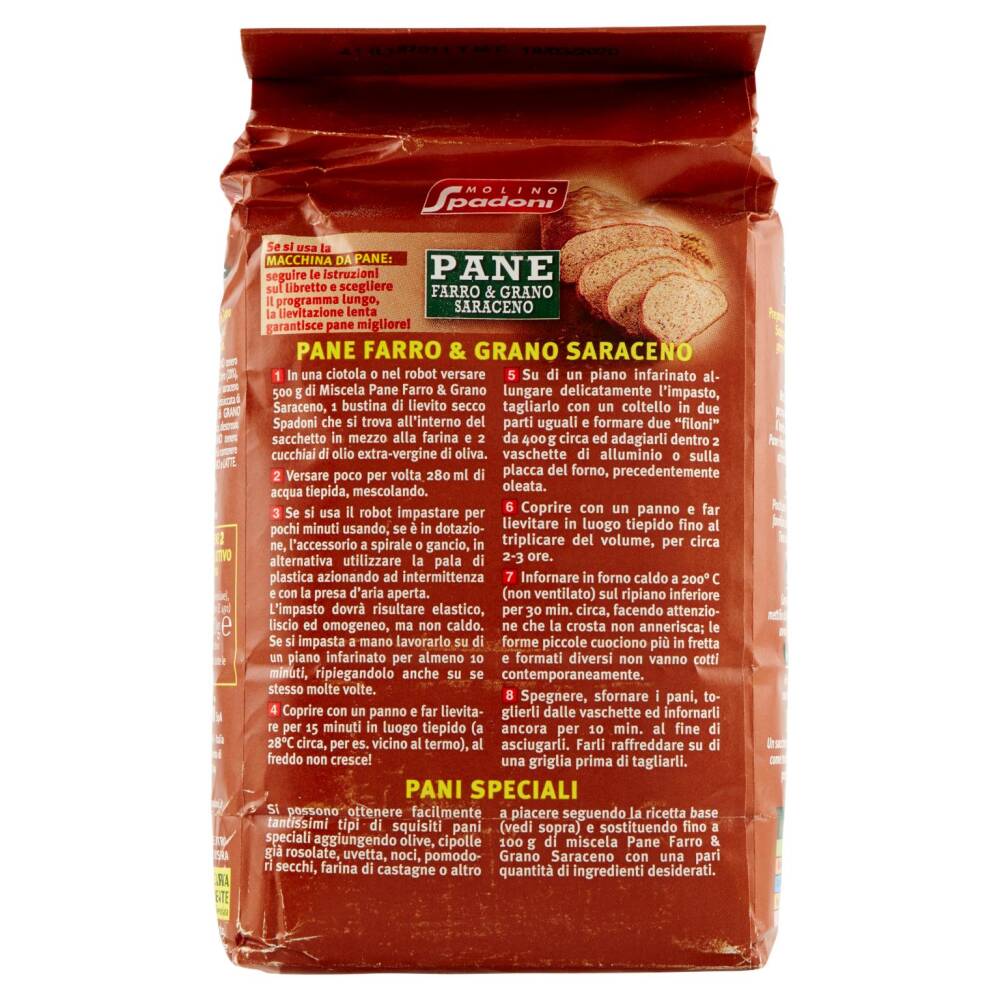 1 In una ciotola o nel robot versare 500 g di Miscela Pane Farro & Grano Saraceno, 1 bustina di lievito secco Spadoni che si trova all'interno del sacchetto in mezzo alla farina e 2 cucchiai di olio extra-vergine di oliva.