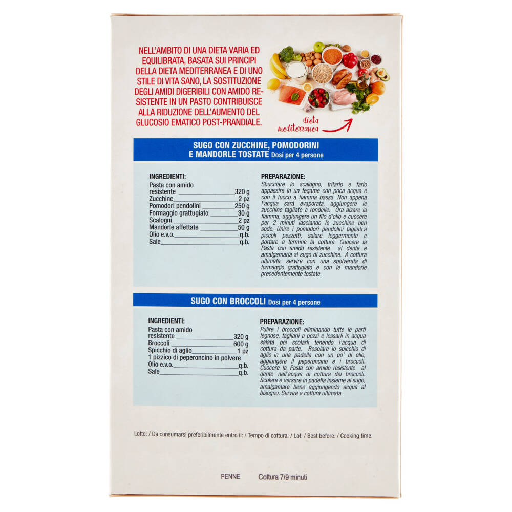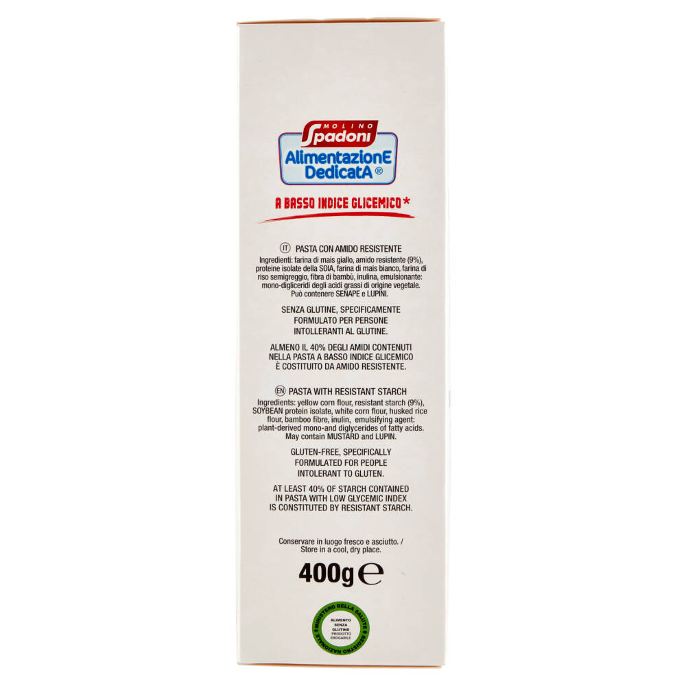 Fonte di proteine Ricca di fibre Senza glutine Specificamente formulato per persone intolleranti al glutine Cottura 7/9 minuti La sostituzione di amidi digeribili con amido resistente in un pasto, contribuisce alla riduzione dell'aumento del glucosio ematico post-prandiale