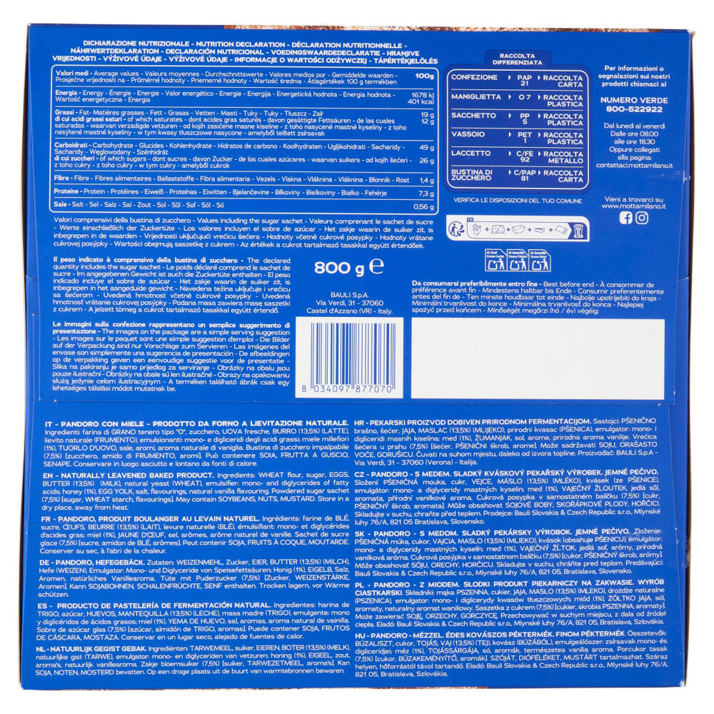 Farina di grano tenero tipo "0" Zucchero Uova fresche Burro (13,5%) (latte) Lievito naturale (frumento) Emulsionanti: mono- e digliceridi degli acidi grassi Miele millefiori (1%) Tuorlo d'uovo Sale Aromi Aroma naturale di vaniglia Bustina di zucchero impalpabile (7,5%) [zucchero, amido di frumento, aromi] Può contenere soia, frutta a guscio, senape