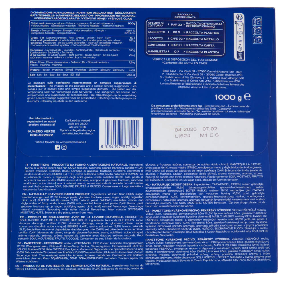 Farina di grano tenero tipo "0" Uova fresche Zucchero Scorze d'arancia candite (11,3%) [scorze d'arancia (Calabria, Italia), sciroppo di glucosio- fruttosio, zucchero, correttori di acidità: acido citrico] Burro (latte) Uvetta sultanina (9,1%) Lievito naturale (frumento) Emulsionanti: mono- e digliceridi degli acidi grassi Miele millefiori (0,6%) Sale Pasta di scorze di limone candite (0,4%) [scorze di limone, sciroppo di glucosio- fruttosio, zucchero, acidificanti: acido citrico] Aromi naturali Aromi Aroma naturale di cannella con altri aromi naturali Può contenere soia, senape, frutta a guscio