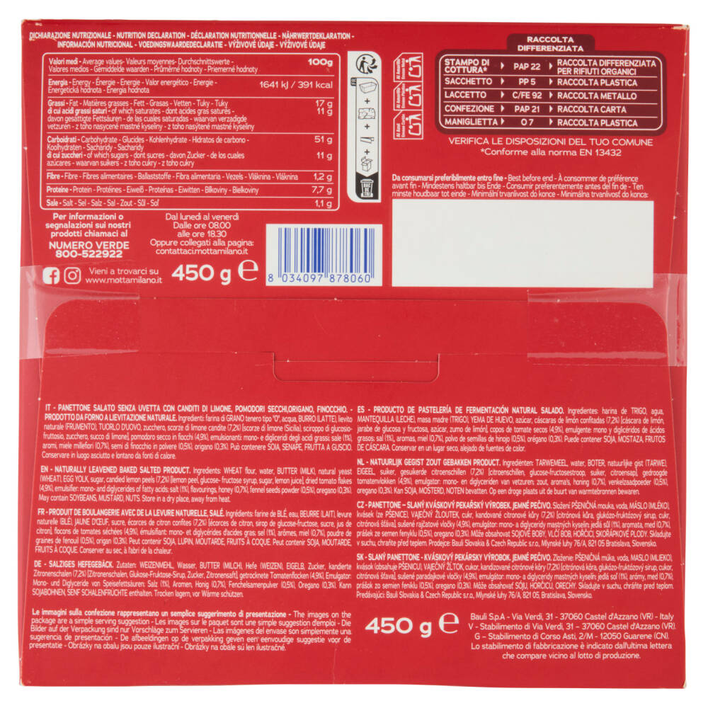 Farina di grano tenero tipo "0" Acqua Burro (latte) Lievito naturale (frumento) Tuorlo d'uovo Zucchero Scorze di limone candite (7,2%) [scorze di limone (Sicilia), sciroppo di glucosio-fruttosio, zucchero, succo di limone] Pomodoro secco in fiocchi (4,9%) Emulsionanti: mono- e digliceridi degli acidi grassi Sale (1%) Aromi Miele millefiori (0,7%) Semi di finocchio in polvere (0,5%) Origano (0,3%) Può contenere soia, senape, frutta a guscio