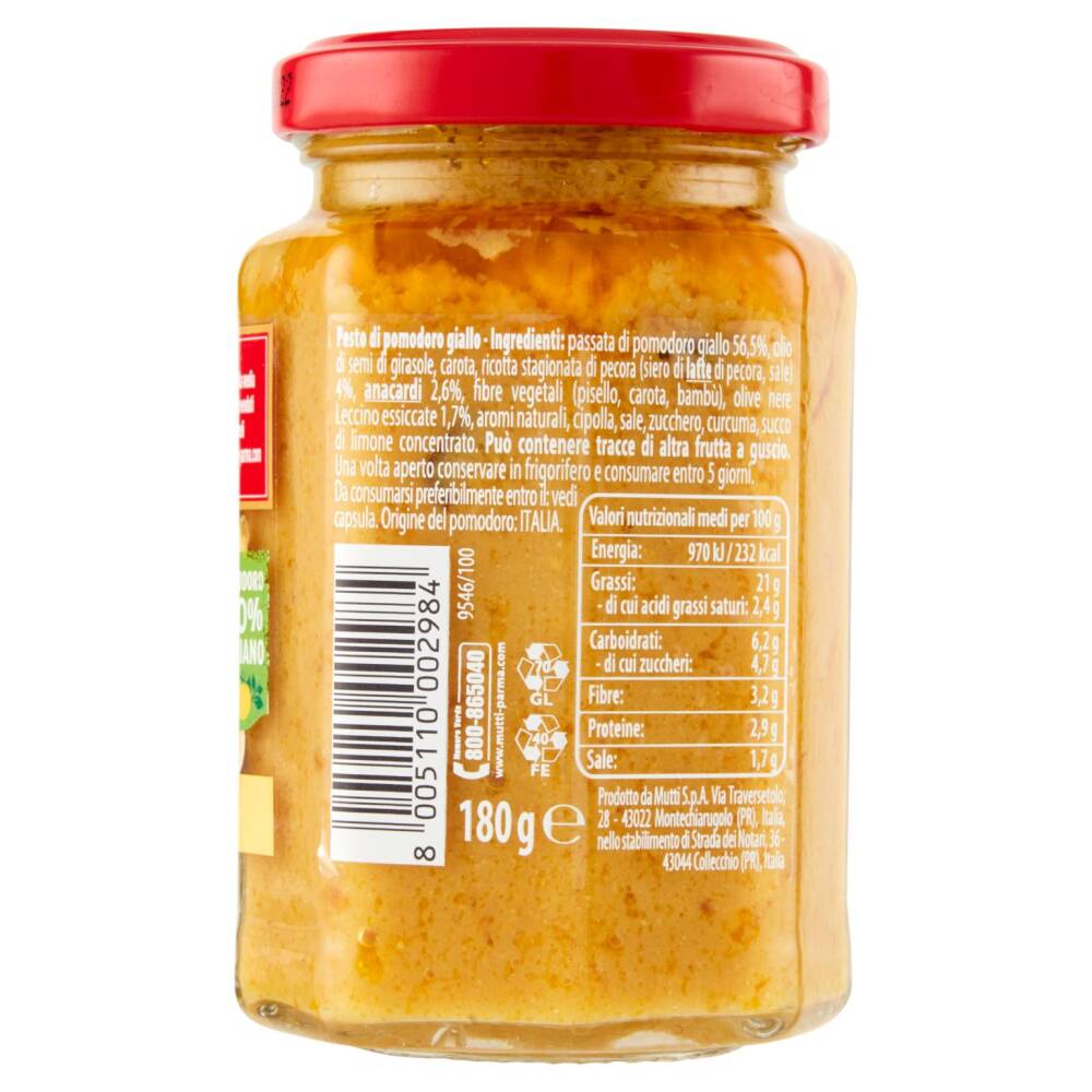 Passata di pomodoro giallo 56,5% Olio di semi di girasole Carota Ricotta stagionata di pecora (siero di latte di pecora, sale) 4% Anacardi 2,6% Fibre vegetali (pisello, carota, bambù) Olive nere Leccino essiccate 1,7% Aromi naturali Cipolla Sale Zucchero Curcuma Succo di limone concentrato Può contenere tracce di altra frutta a guscio