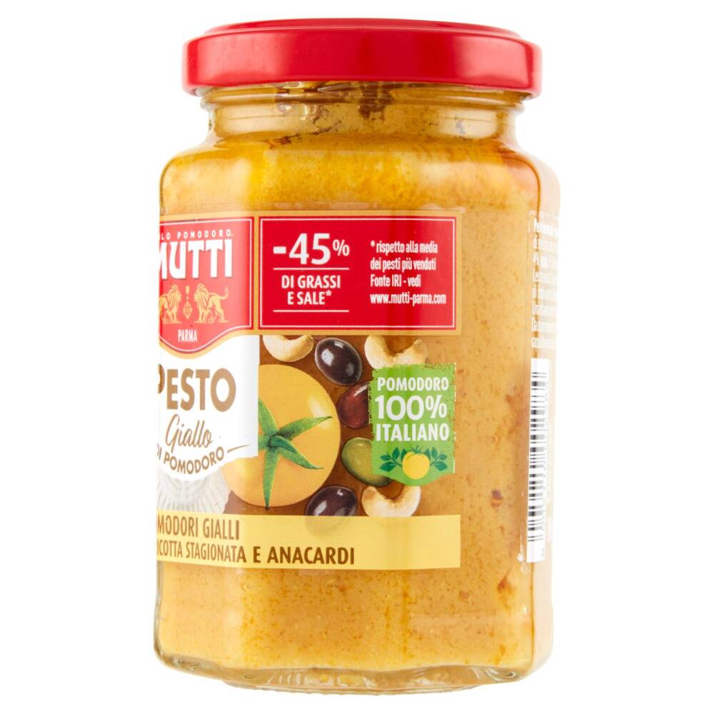 -45% di grassi e sale* Pomodoro 100% italiano Pomodori gialli, olive leccino, ricotta stagionata e anacardi *rispetto alla media dei pesti più venduti Fonte IRI - vedi www.mutti-parma.com