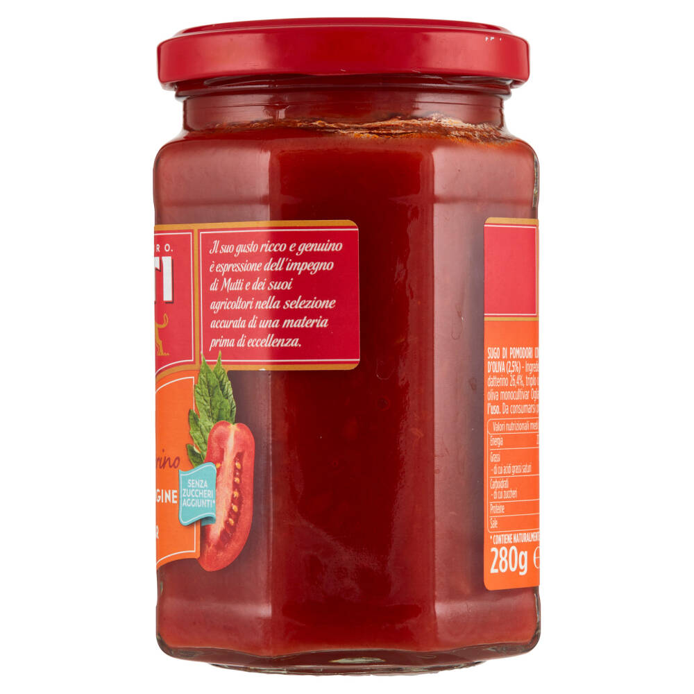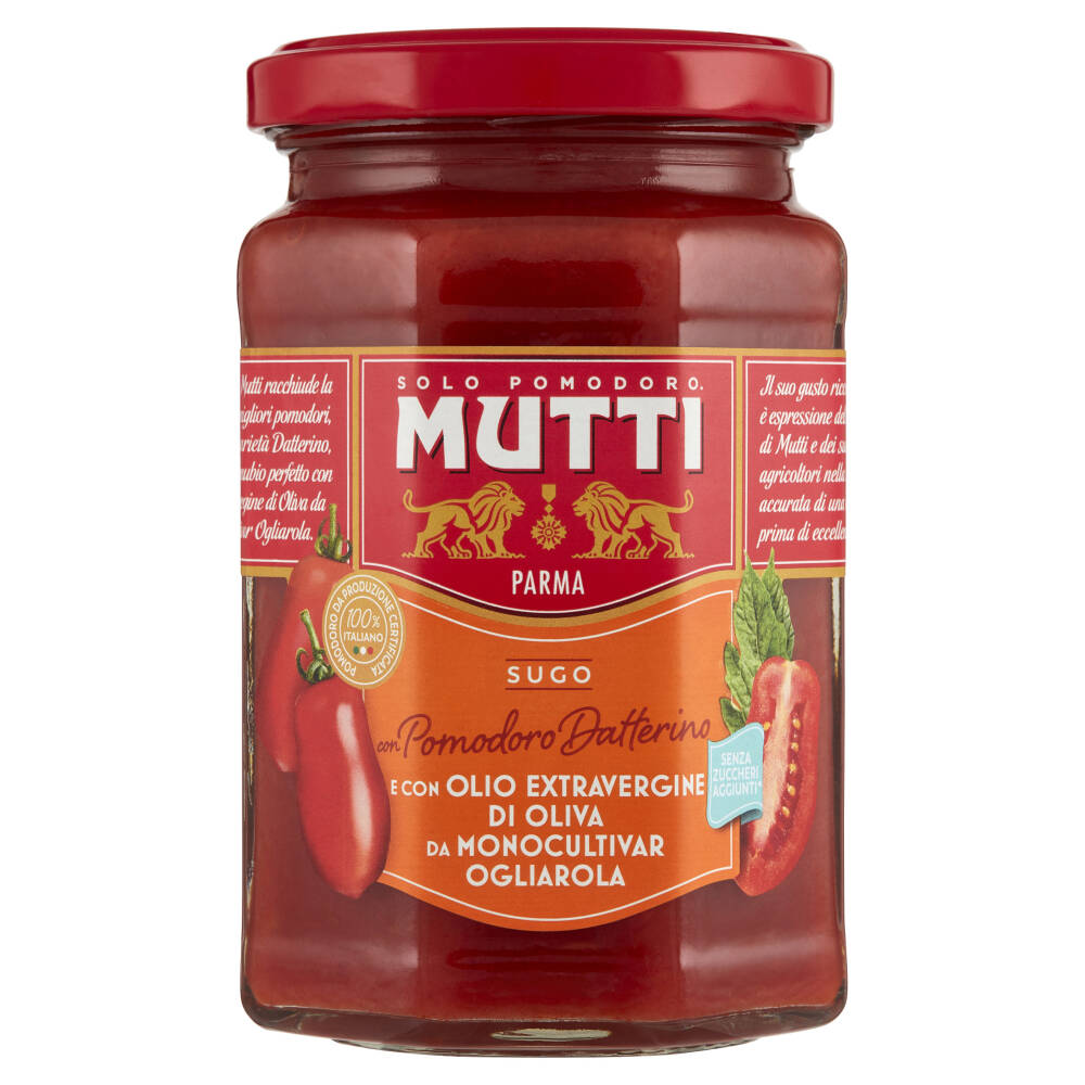 Questo Sugo Mutti racchiude la selezione dei migliori pomodori, tra cui la varietà Datterino, creando il connubio perfetto con l'Olio Extravergine di Oliva da Monocultivar Ogliarola.
