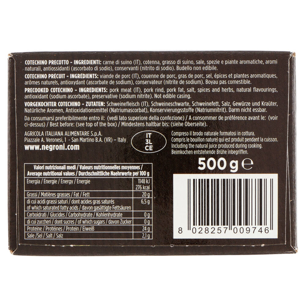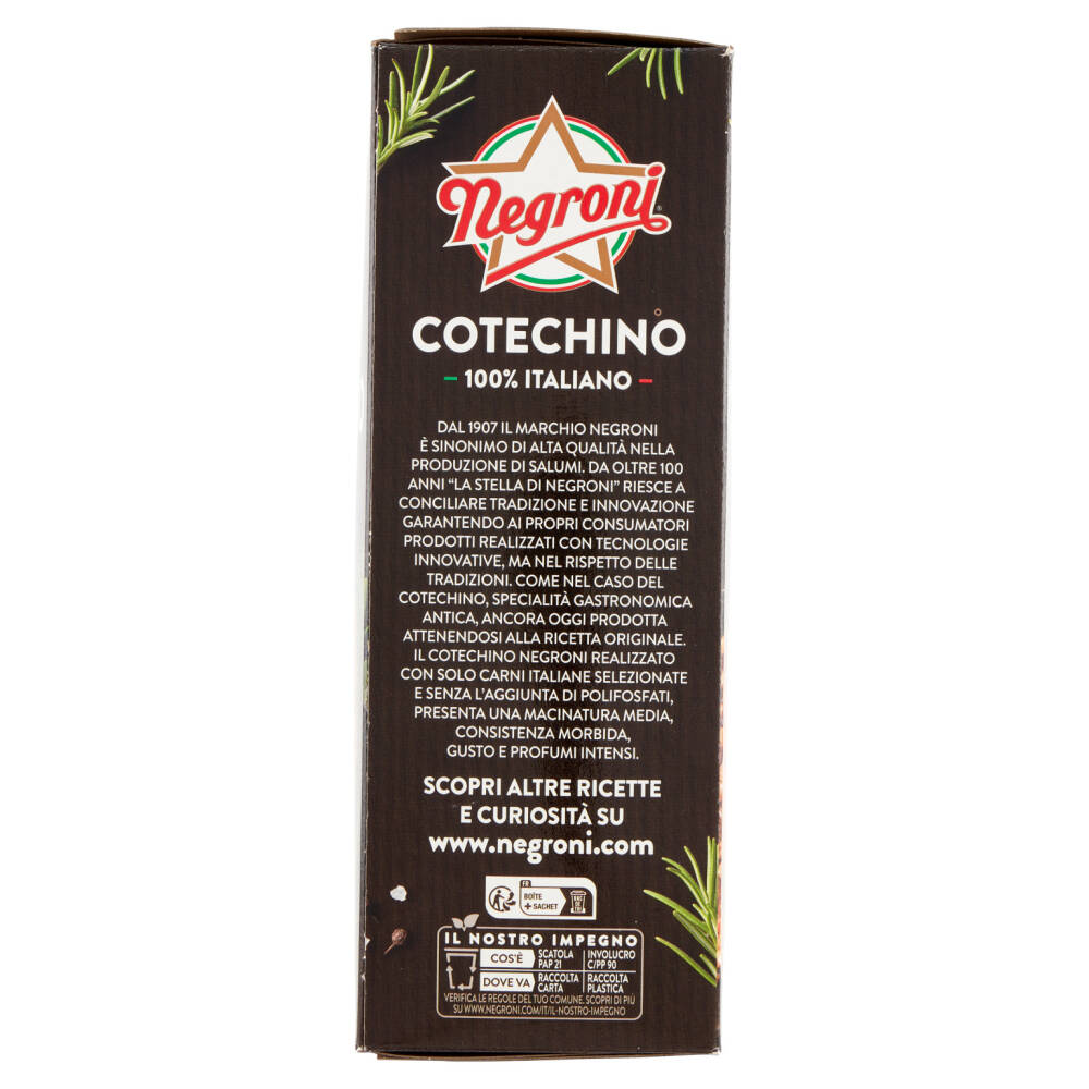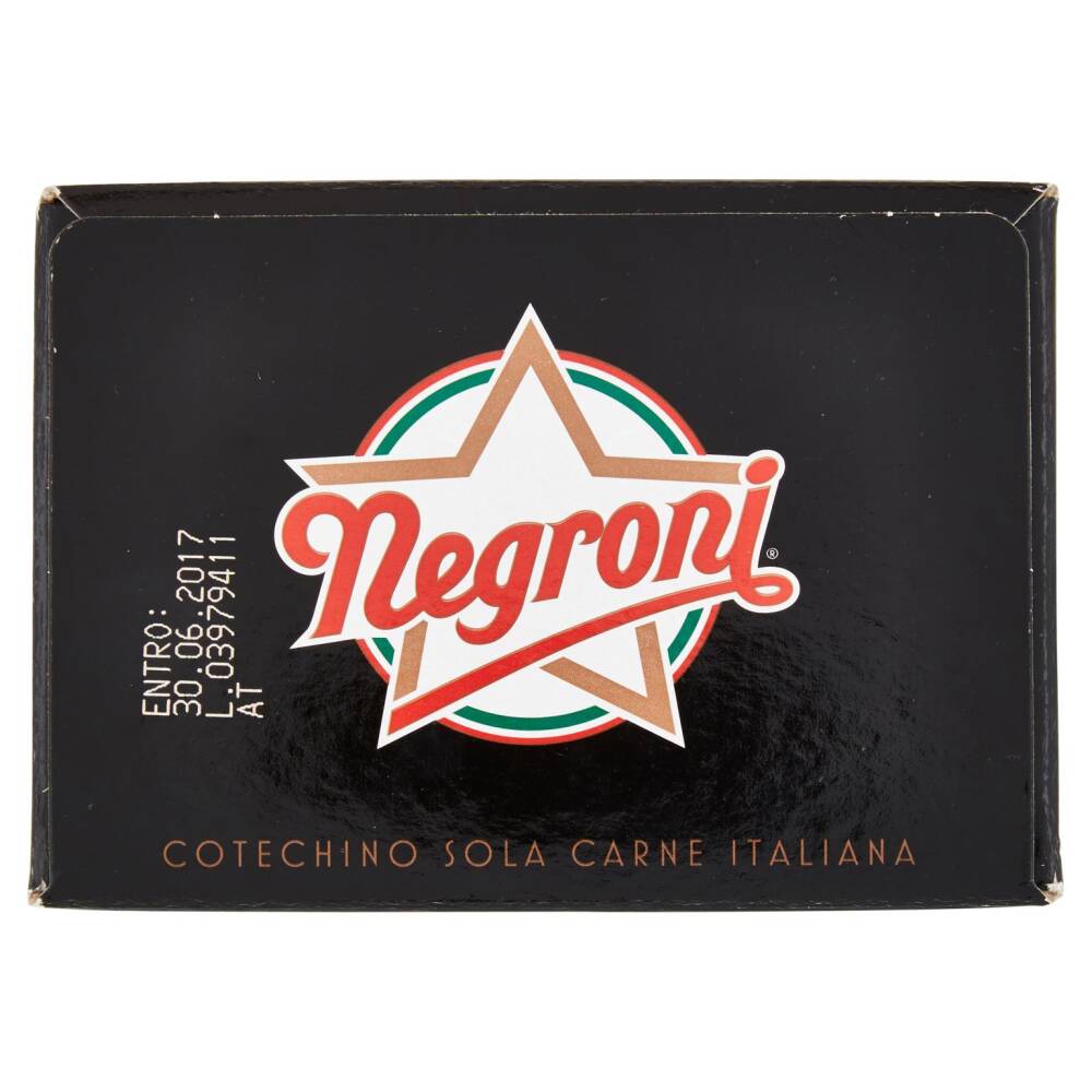 Dal 1907 il marchio Negroni è sinonimo di Alta Qualità nella produzione di salumi. Da oltre 100 anni "La Stella di Negroni" riesce a conciliare tradizione e innovazione garantendo ai propri consumatori prodotti realizzati con tecnologie innovative, ma nel rispetto delle tradizioni. Come nel caso del Cotechino, specialità gastronomica antica, ancora oggi prodotta attenendosi alla ricetta originale. Il Cotechino Negroni realizzato con solo carni italiane selezionate e senza l'aggiunta di polifosfati, presenta una macinatura media, consistenza morbida, gusto e profumi intensi.
