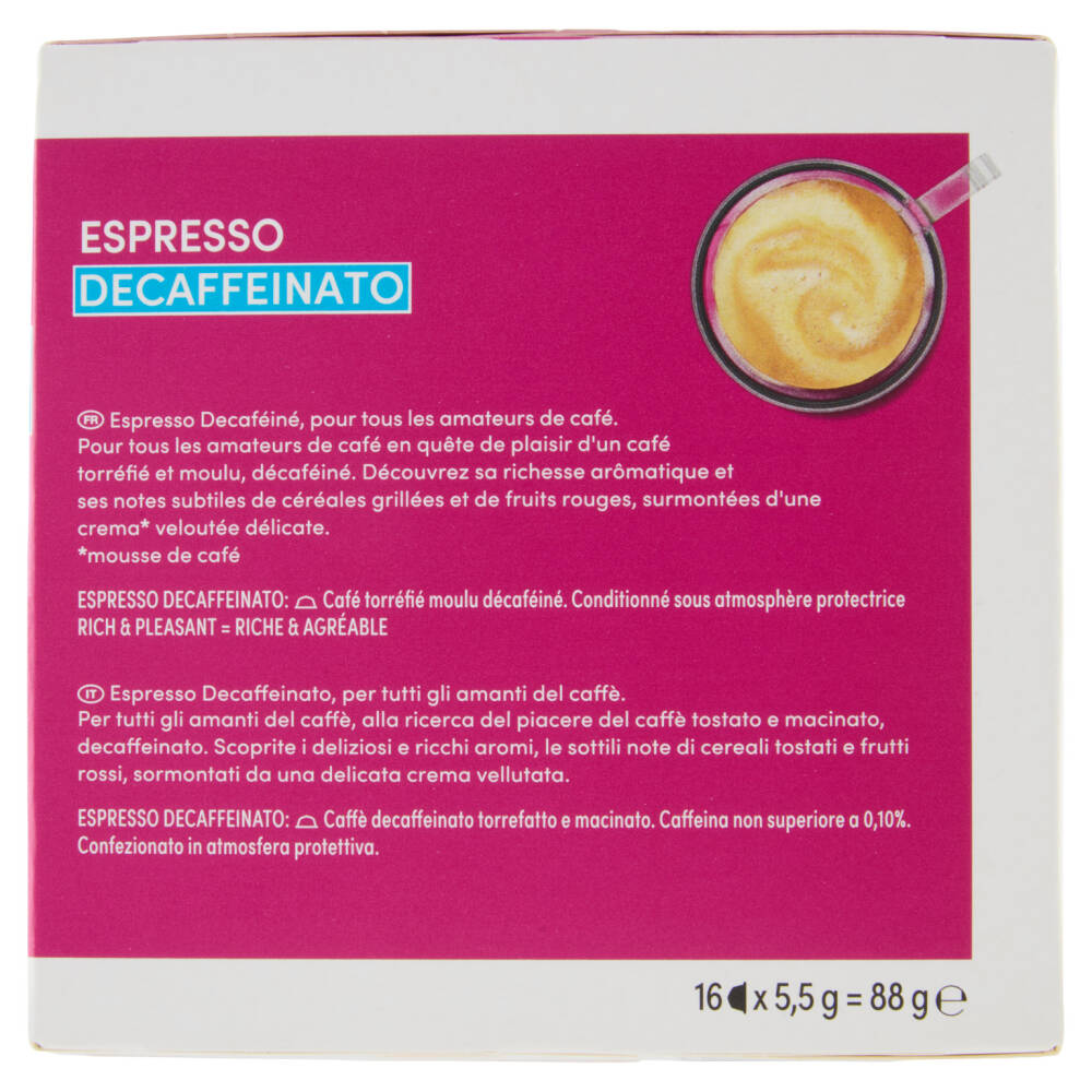 Espresso decaffeinato: Caffè decaffeinato torrefatto e macinato. Caffeina non superiore a 0,10%. Confezionato in atmosfera protettiva