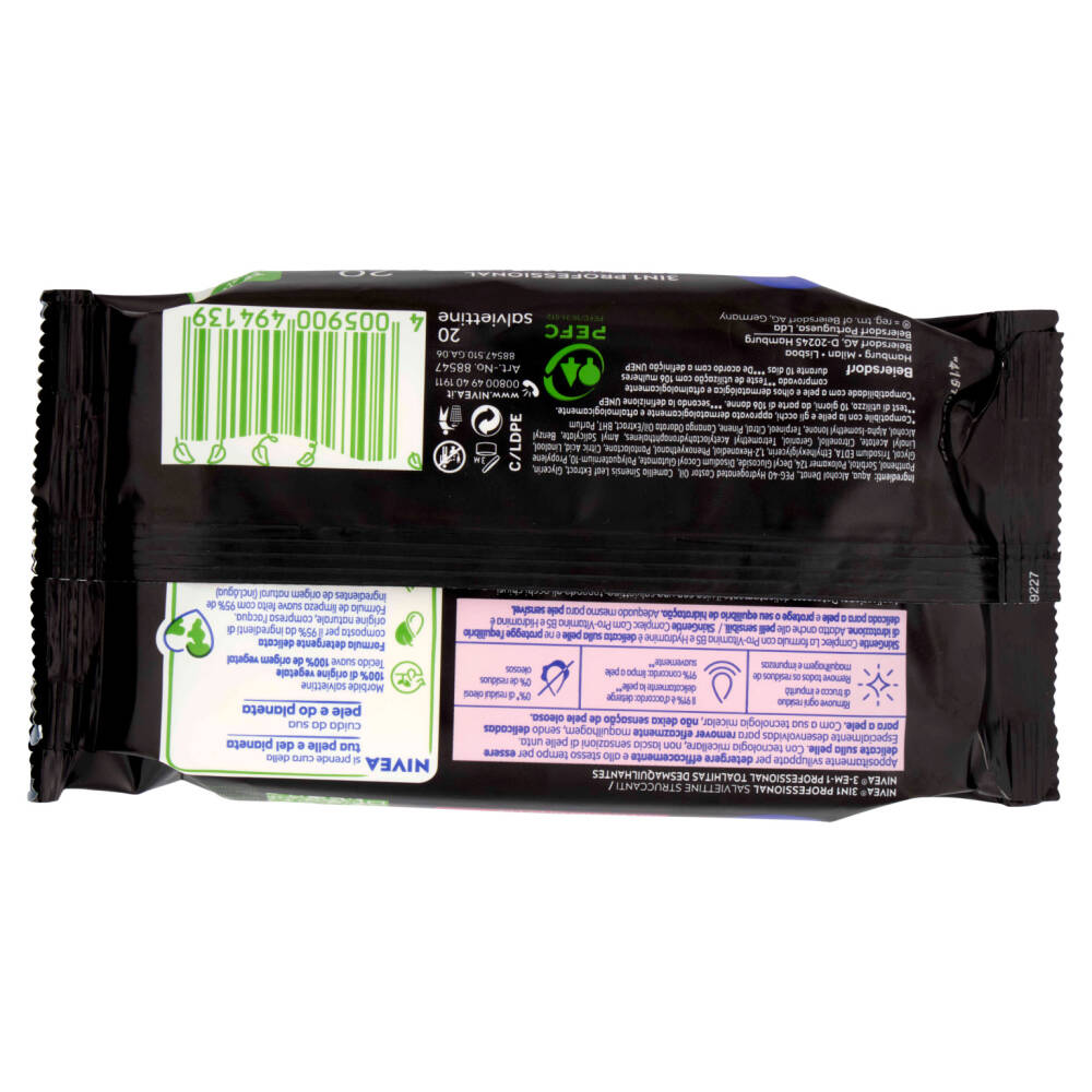 Applicazione: Detergere delicatamente il viso con una salviettina, tenendo gli occhi chiusi. Richiudere la confezione dopo l'uso per evitare che le salviettine si secchino. Non gettare nel WC.