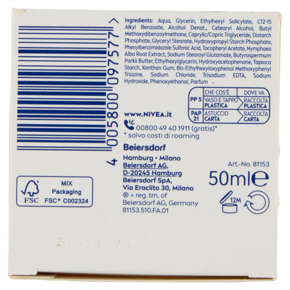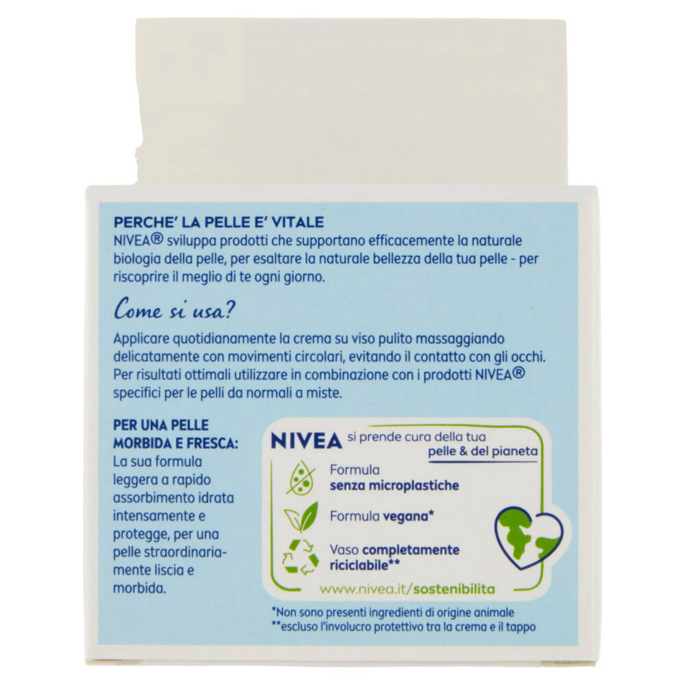 Applicare quotidianamente la crema su viso pulito massaggiando delicatamente con movimenti circolari, evitando il contatto con gli occhi. Per risultati ottimali utilizzare in combinazione con i prodotti Nivea specifici per le pelli da normali a miste.