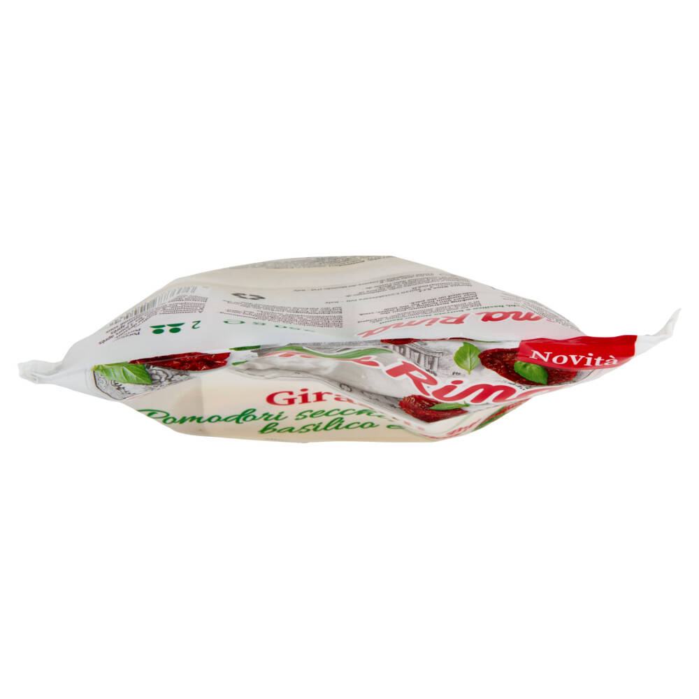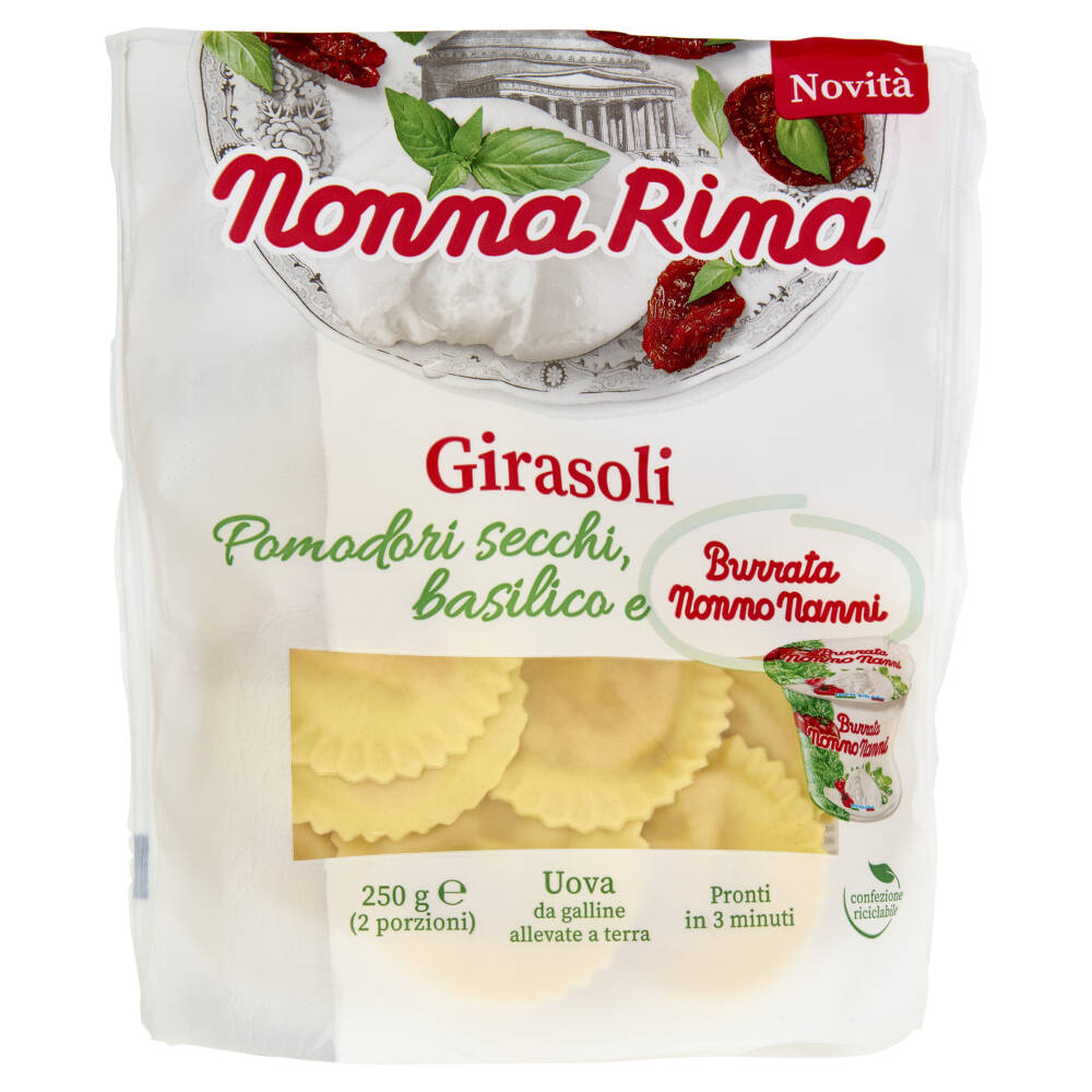 Ingredienti del ripieno 60%: ricotta 16% (siero di latte, sale), burrata 16% (latte pastorizzato, crema di latte, sale, caglio, fermenti lattici), mozzarella13% (latte, sale, enzima coagulante), pomodori semi secchi pelati 10%, pangrattato (farina di grano tenero tipo "0", lievito di birra, sale), panna, siero di latte, olio di semi di girasole, lattosio, amido, formaggio grattugiato(latte, sale, caglio), doppio concentrato di pomodoro 2,5%, semilavorato al basilico 1,9% (basilico 89%, olio di semi di girasole, sale), pomodori secchi 1,5%, sale, fibra di patate