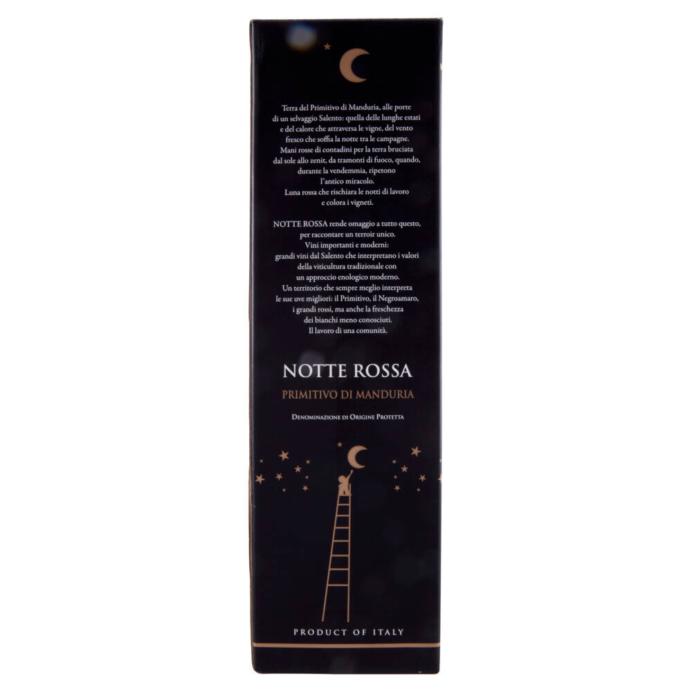Terra del Primitivo di Manduria, alle porte di un selvaggio Salento: quella delle lunghe estati e del calore che attraversa le vigne, del vento fresco che soffia la notte tra le campagne. Mani rosse di contadini per la terra bruciata dal sole allo zenit, da tramonti di fuoco, quando, durante la vendemmia, ripetono l'antico miracolo. Luna rossa che rischiara le notti di lavoro e colora i vigneti.