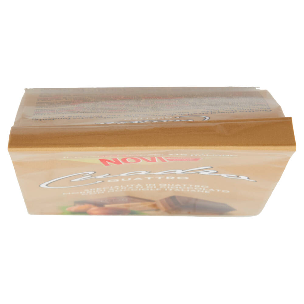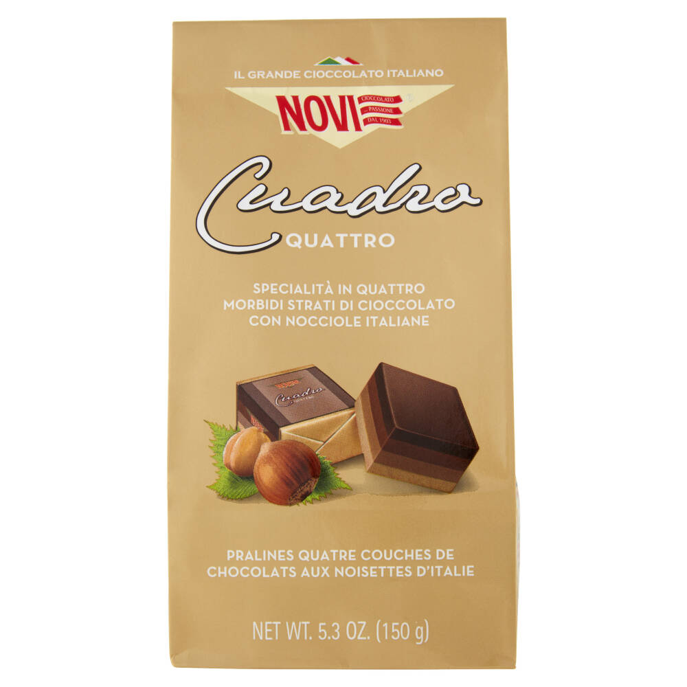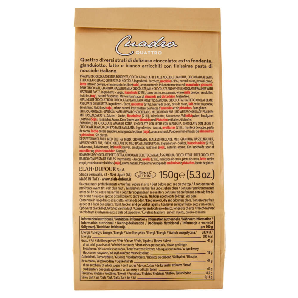 Quattro diversi strati di delizioso cioccolato: extra fondente, gianduiotto, latte e bianco arricchiti con finissima pasta di nocciole italiane.