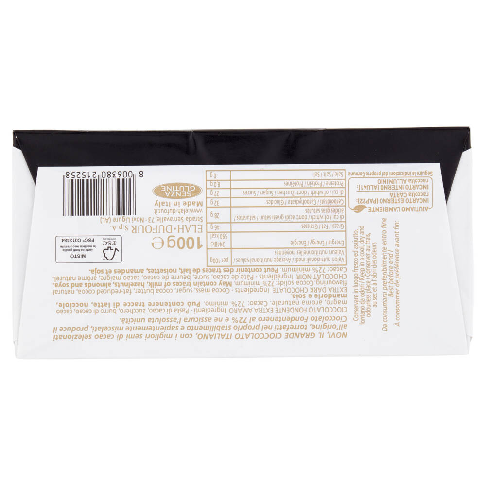 Novi, il grande cioccolato italiano, con i migliori semi di cacao selezionati all'origine, torrefatti nel proprio stabilimento e sapientemente miscelati, produce il Cioccolato Fondentenero al 72% e ne assicura l'assoluta unicità.