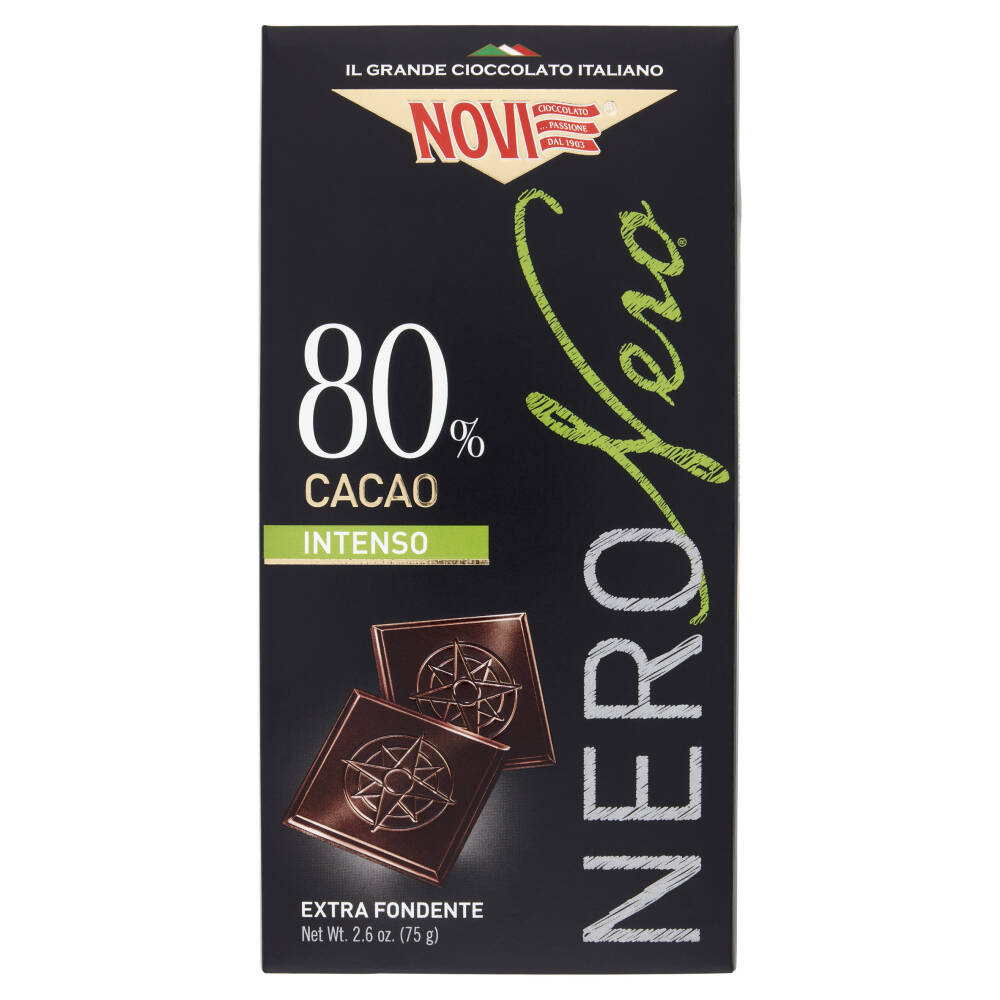Nero Nero 80%. Una sapiente miscela di pregiati cacao, tostati con cura nello stabilimento Novi, crea un cioccolato in cui forza e intensità si esprimono con sorprendente piacevolezza.