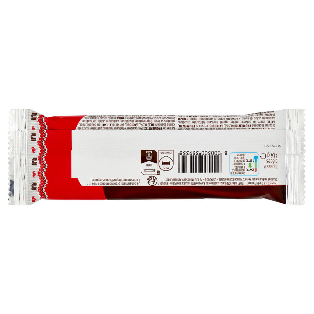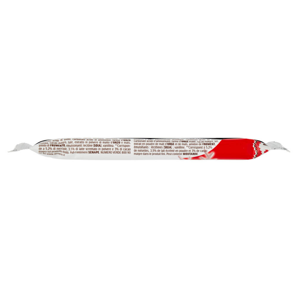 Crema alle nocciole e al cacao 40% (zucchero, olio di palma, nocciole 13%**, latte scremato in polvere 8,7%**, cacao magro 7,4%**, emulsionanti: lecitine (soia); vanillina) Farina di frumento (32,5%) Grassi vegetali (palma, palmisto) Zucchero di canna (contiene frumento) (8,5%) Lattosio Crusca di frumento Latte intero in polvere Miele Agenti lievitanti (difosfato disodico, carbonato acido di sodio, carbonato acido di ammonio) Farina d'orzo maltata Cacao magro Sale Estratto in polvere di malto d'orzo e mais Amido di frumento Emulsionanti: lecitine (soia) Vanillina **Corrisponde a 5,2% di nocciole, 3,5% di latte scremato in polvere e 3% di cacao magro sul prodotto finito Può contenere senape