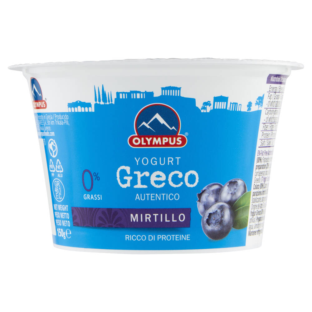 Yogurt greco colato (80%): latte scremato pastorizzato, fermenti lattici vivi (L. Bulgaricus, S. Thermophilus) Preparazione al mirtillo (20%): zucchero, pezzi di mirtillo (7% nel prodotto finito), acqua, amido di mais, stabilizzante: carragenina, aromi naturali, concentrato di succo di limone Aromi naturali