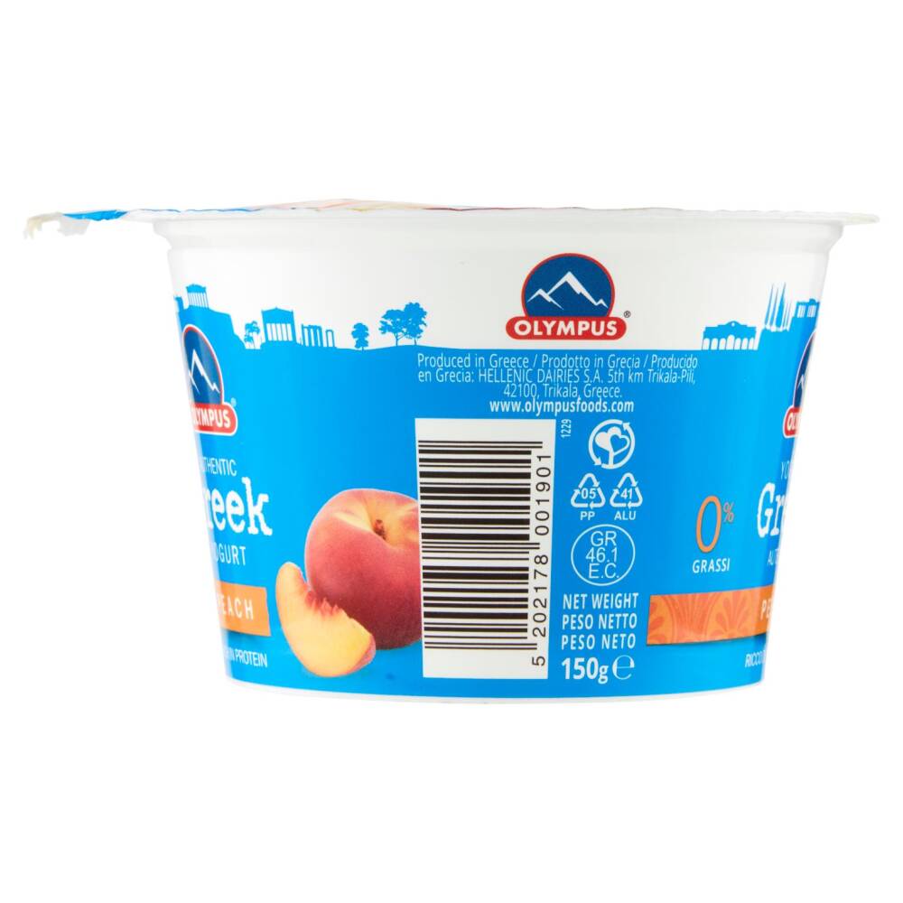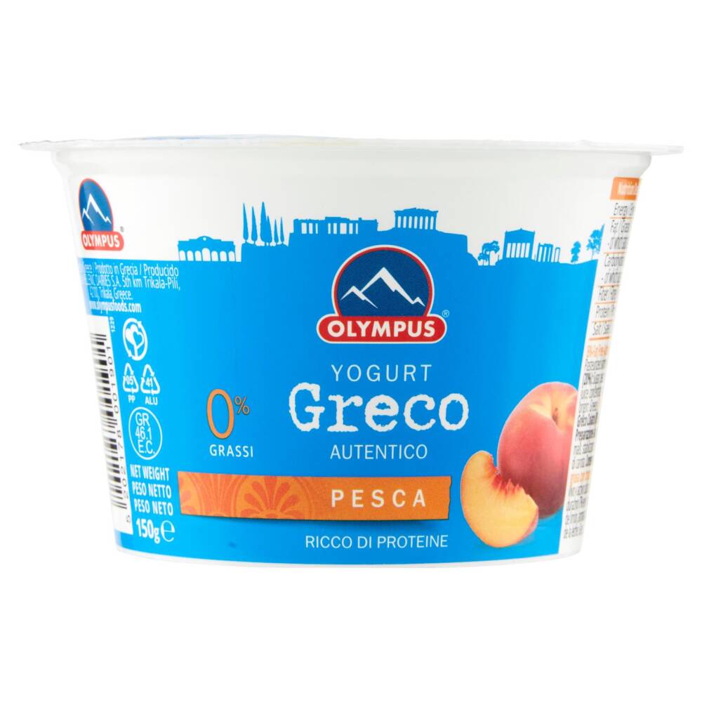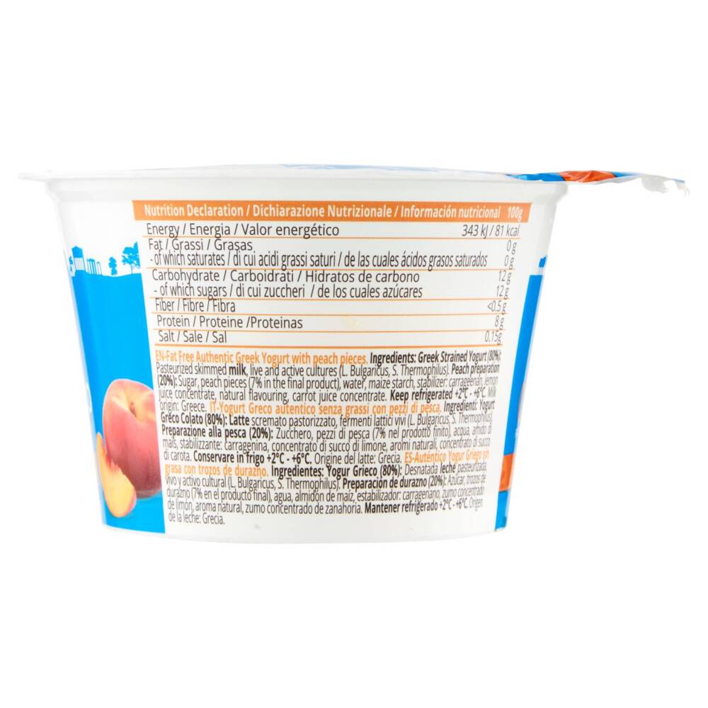 Yogurt greco colato (80%): latte scremato pastorizzato, fermenti lattici vivi (L. Bulgaricus, S. Thermophilus) Preparazione alla pesca (20%): zucchero, pezzi di pesca (7% nel prodotto finito), acqua, amido di mais, stabilizzante: carragenina, concentrato di succo di limone, aromi naturali, concentrato di succo di carota