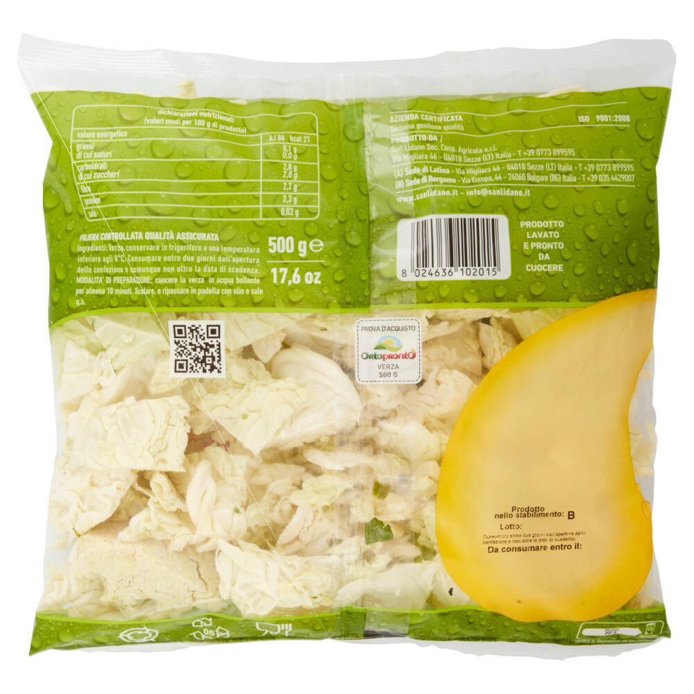 Modalità di preparazione: cuocere la verza in acqua bollente per almeno 10 minuti. Scolare, e ripassare in padella con olio e sale q.b.