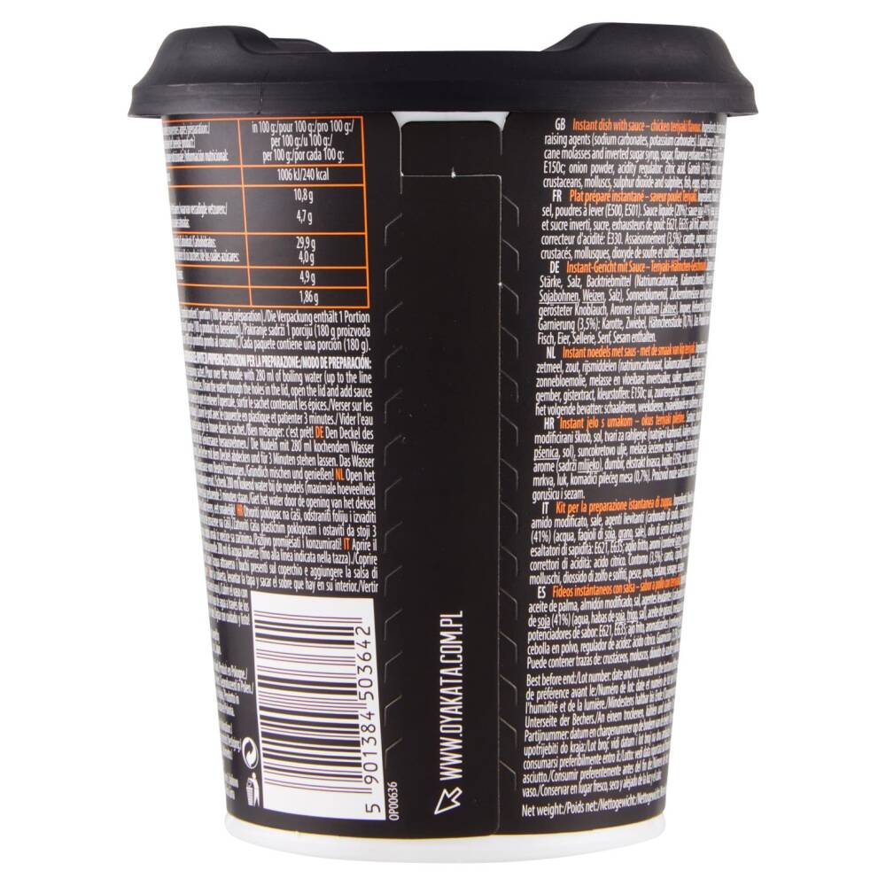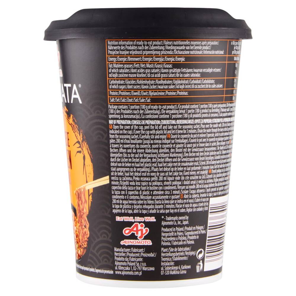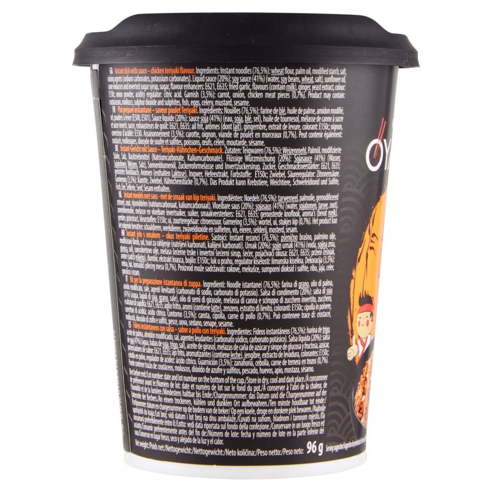Noodle istantanei (76,5%): farina di grano, olio di palma, amido modificato, sale, agenti lievitanti (carbonato di sodio, carbonato di potassio)