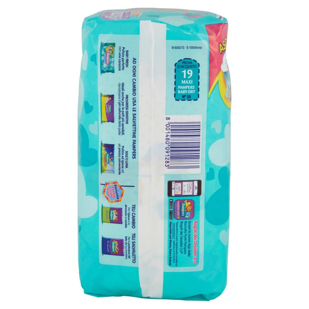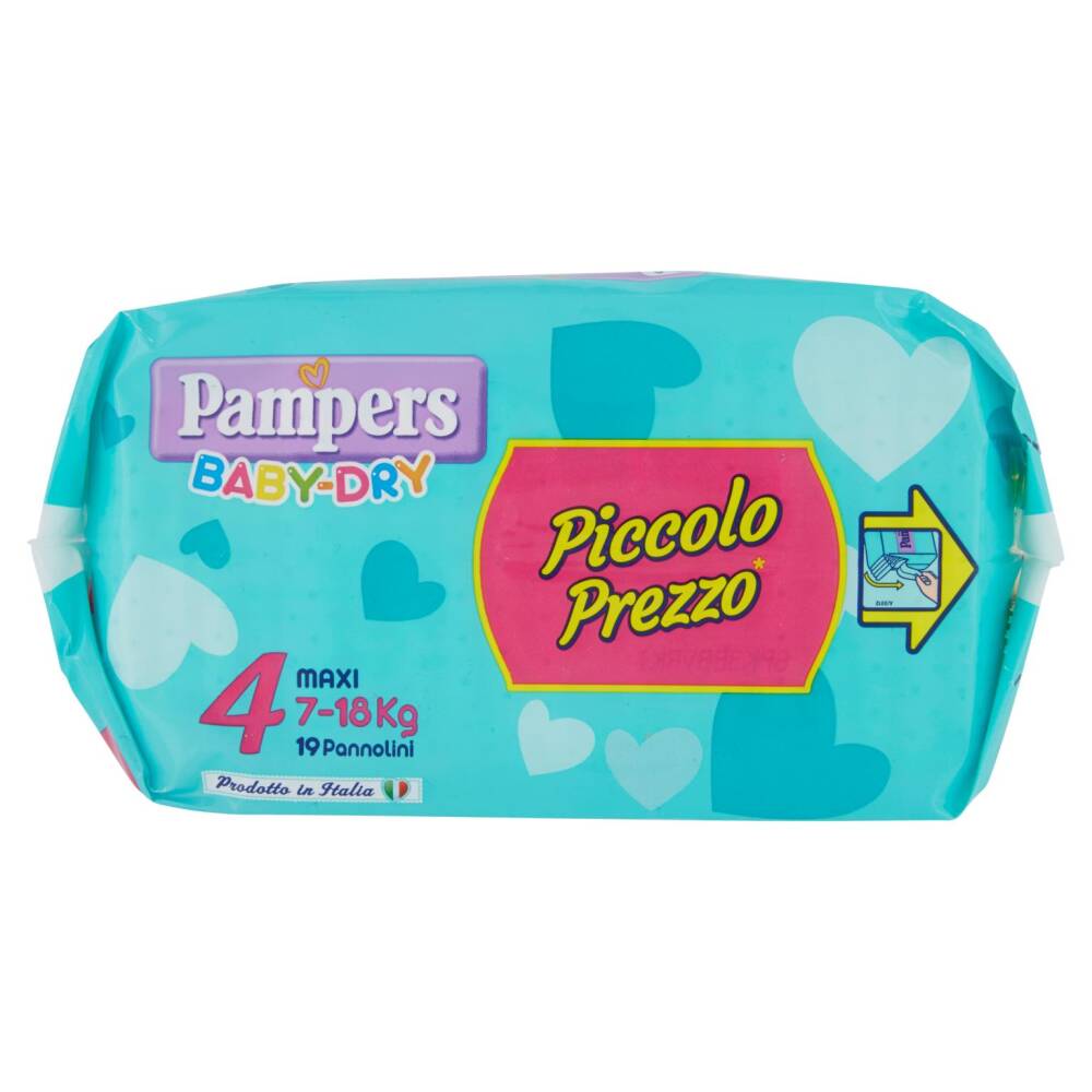 Asciutto che respira 4 Maxi 7-18 Kg 19 Pannolini Clinicamente testato Super avvolgente Prodotto in Italia Piccolo Prezzo* *Formato con il numero di pezzi più piccolo all'interno della gamma Baby-Dry taglia Maxi. Il prezzo finale è a totale discrezione del rivenditore