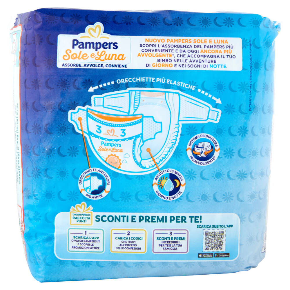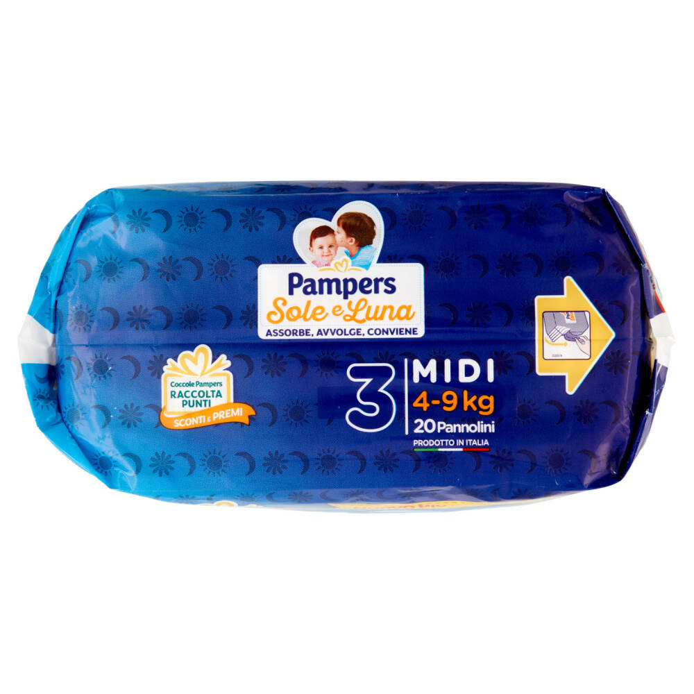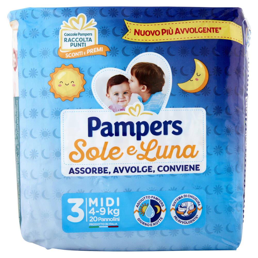 Nuovo più avvolgente* Assorbe, avvolge, conviene 4-9 kg 20 Pannolini Prodotto in Italia Asciutto Pampers - Giorno e notte Sistema di chiusura - Più avvolgente* *rispetto alla versione precedente di Pampers Sole e Luna