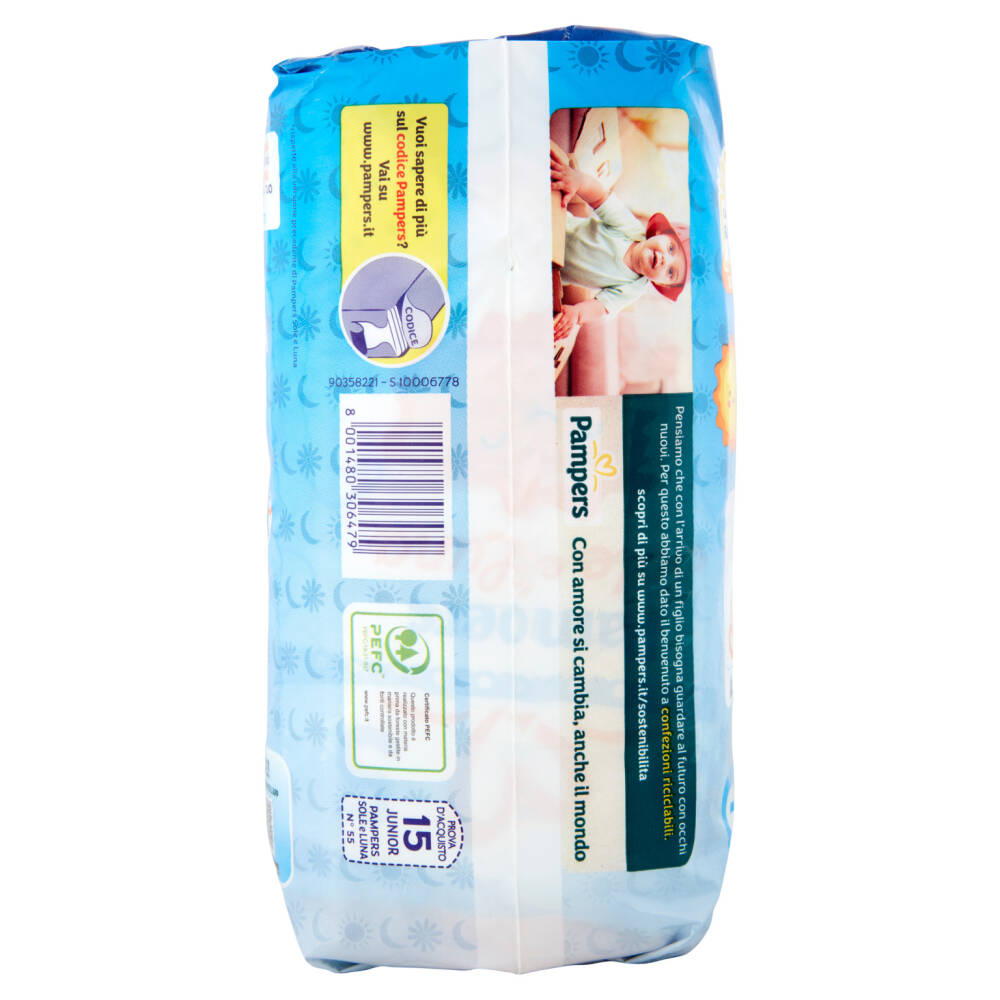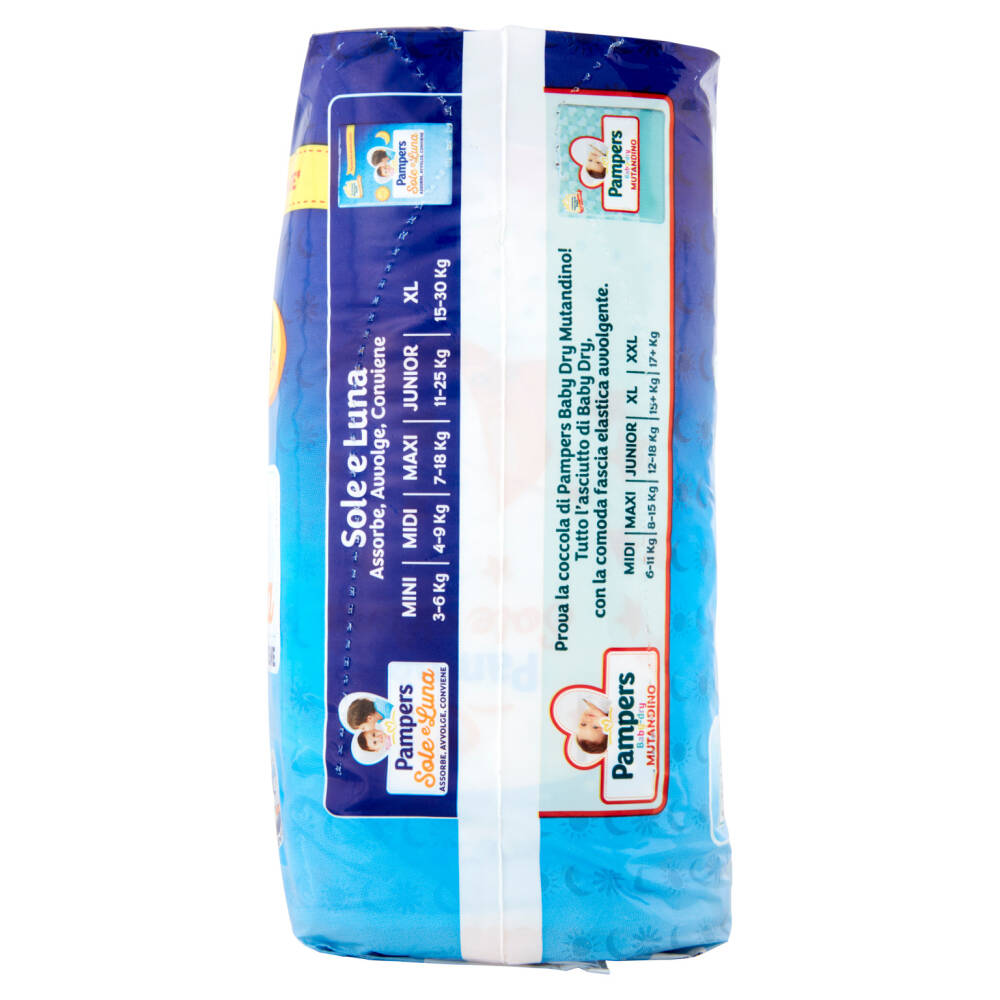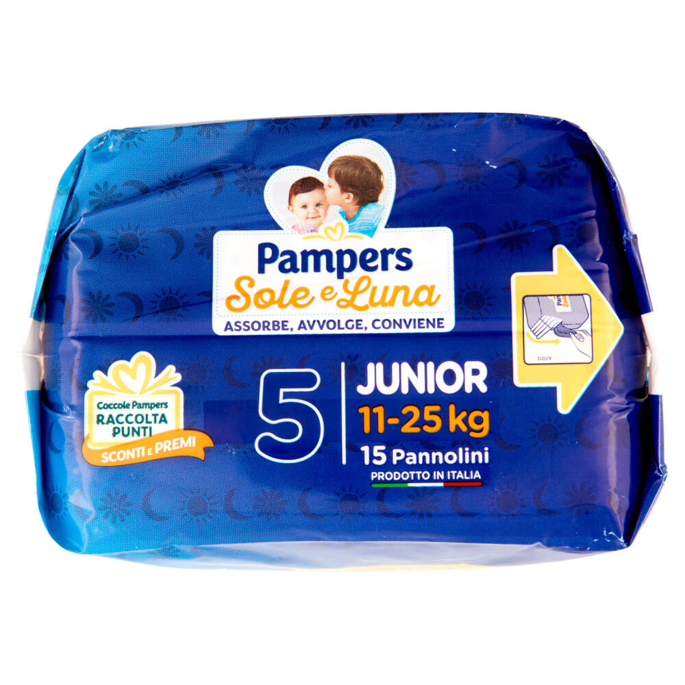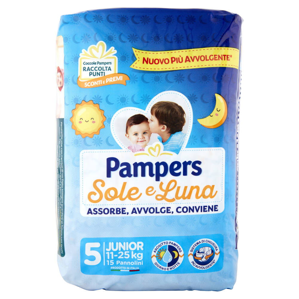 Nuovo più avvolgente* Assorbe, avvolge, conviene 11-25 kg 15 Pannolini Prodotto in Italia Asciutto Pampers - Giorno e notte Sistema di chiusura - Più avvolgente* *rispetto alla versione precedente di Pampers Sole e Luna