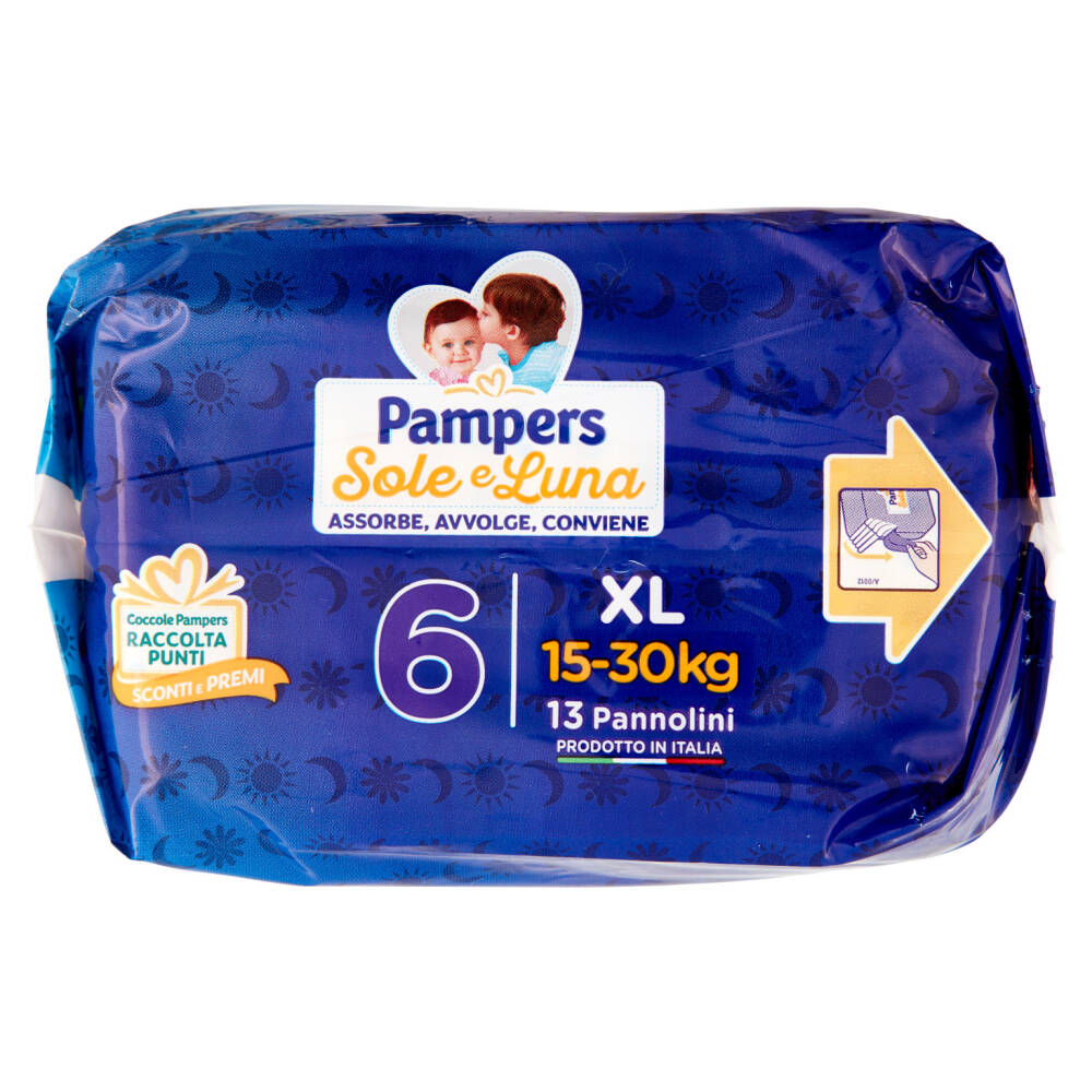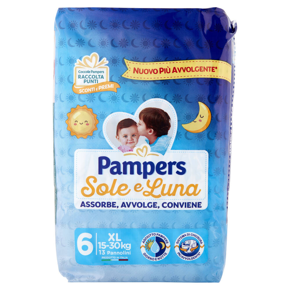 Nuovo più avvolgente* Assorbe, avvolge, conviene 15-30 kg 13 Pannolini Prodotto in Italia Asciutto Pampers - Giorno e notte Sistema di chiusura - Più avvolgente* *rispetto alla versione precedente di Pampers Sole e Luna