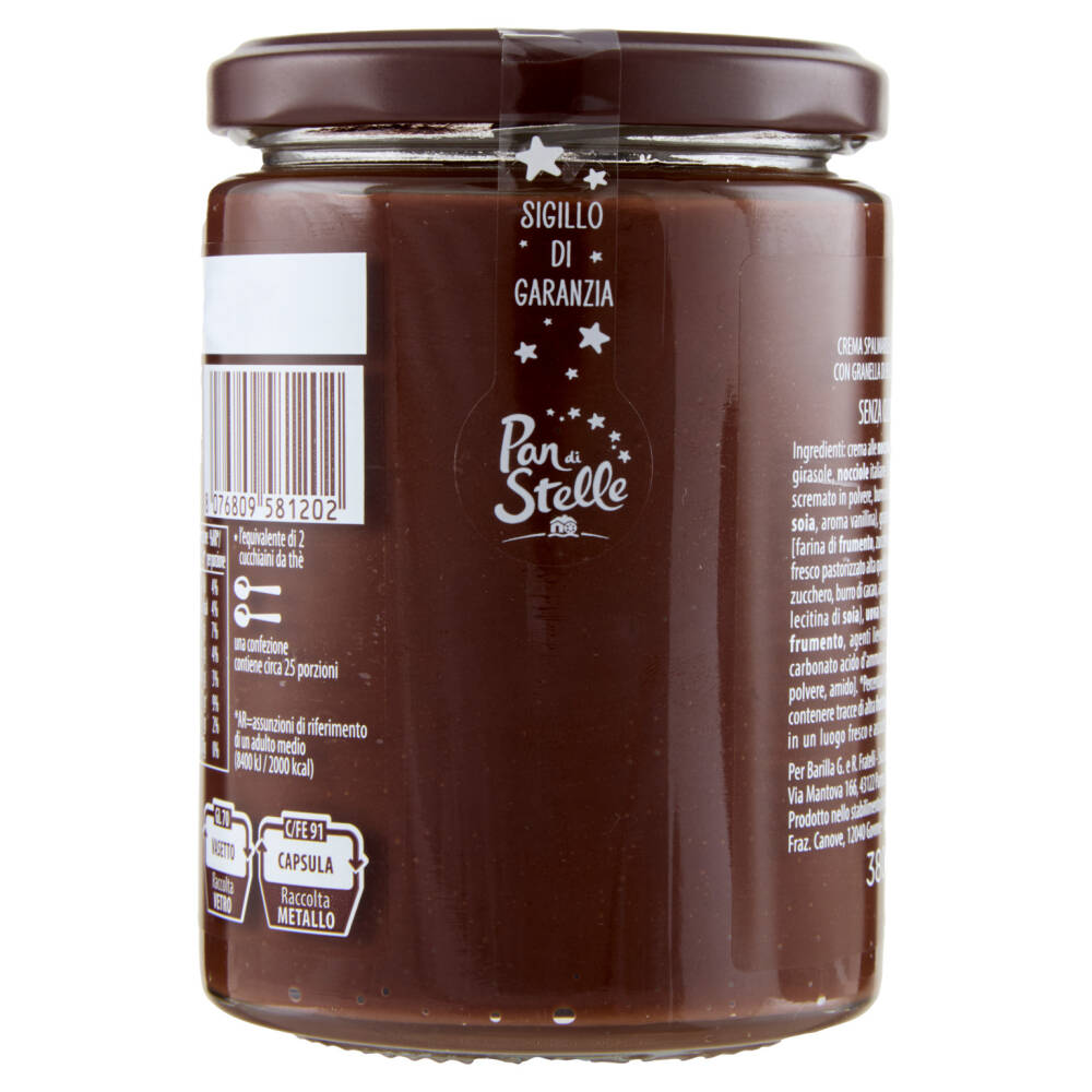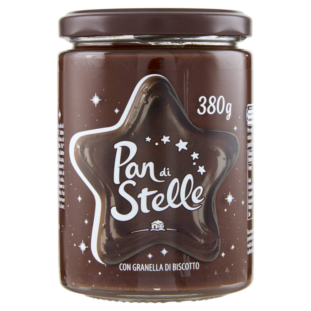 Granella di biscotto Pan di Stelle 2%* [farina di frumento, zucchero, olio di girasole, burro, latte fresco pastorizzato alta qualità, cacao, cioccolato (pasta di cacao, zucchero, burro di cacao, aroma naturale vaniglia, emulsionante: lecitina di soia), uova fresche, miele, nocciole, amido di frumento, agenti lievitanti (carbonato acido di sodio, carbonato acido d'ammonio), sale, aromi, albume d'uovo in polvere, amido]