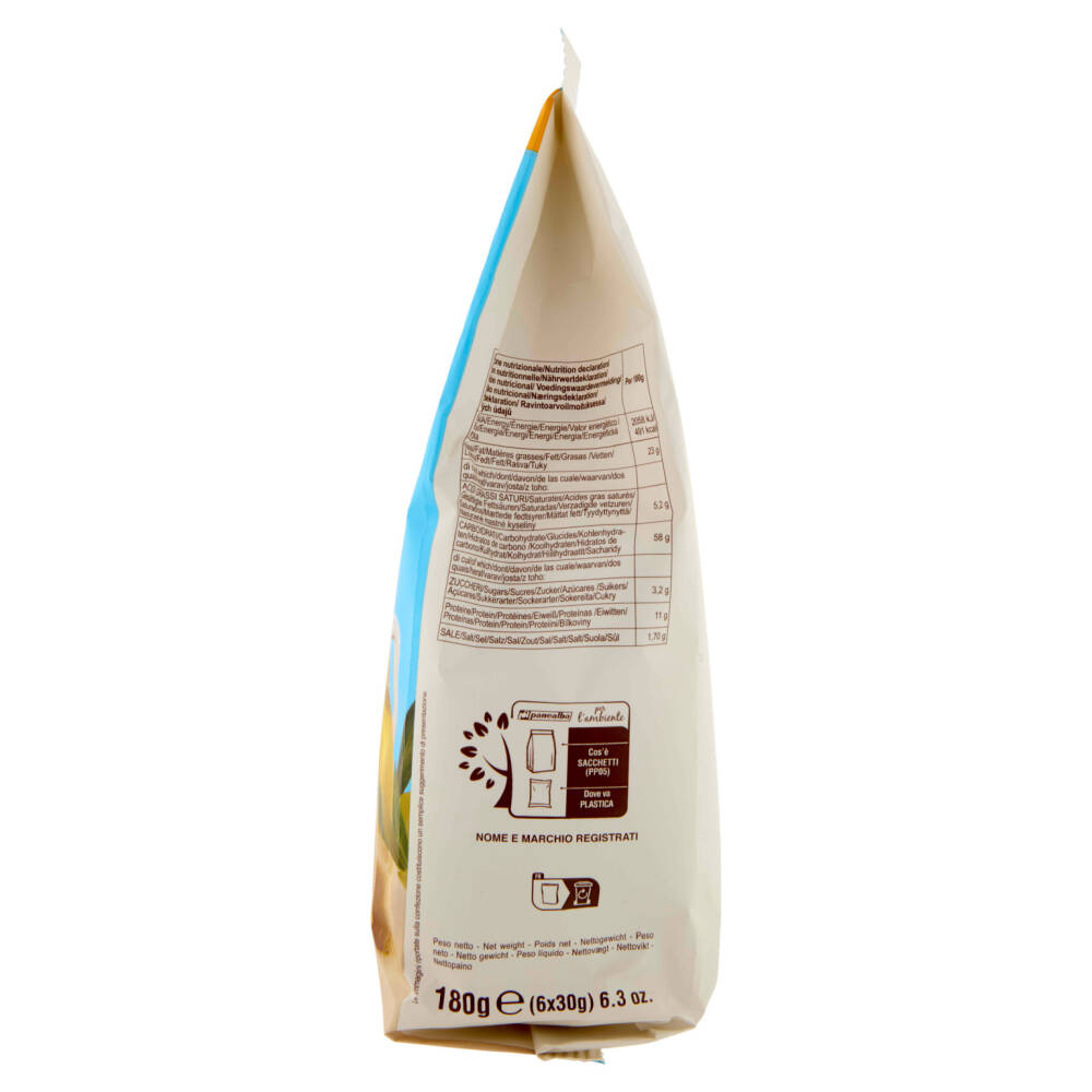 Farina di grano tenero tipo "0" Olio di oliva 13% Olio di palma Lievito di birra Sale Farina di frumento maltato Può contenere semi di sesamo, soia e senape