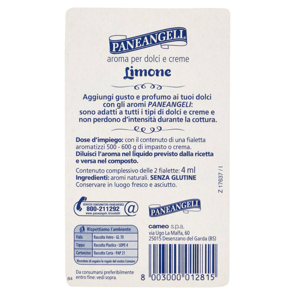 Dose d'impiego: con il contenuto di una fialetta aromatizzi 500 - 600 g di impasto o crema.