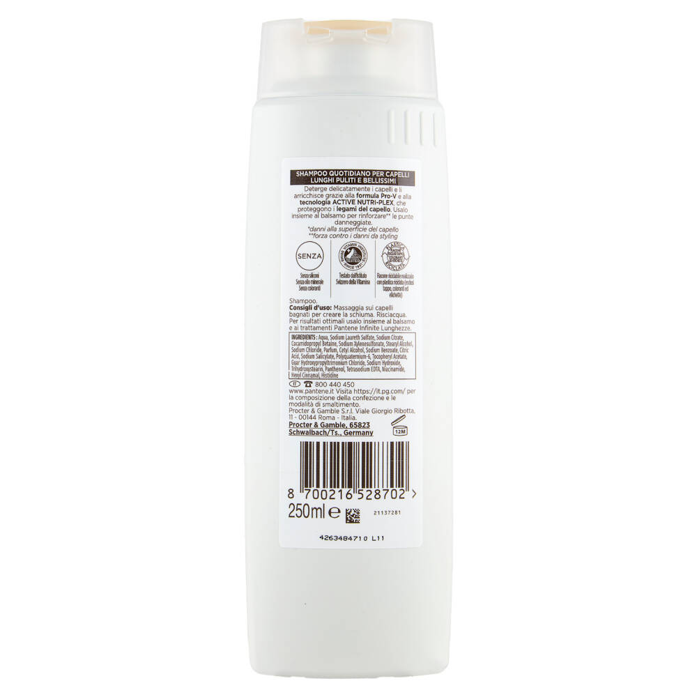 Consigli d'uso: Massaggia sui capelli bagnati per creare la schiuma. Risciacqua. Per risultati ottimali usalo insieme al balsamo e ai trattamenti Pantene Infinite Lunghezze.