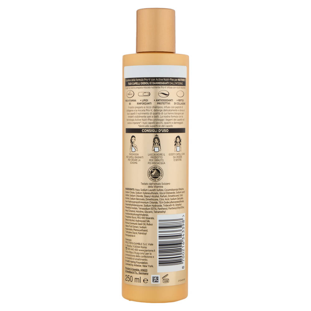 Il nostro pregiato e ricco shampoo, infuso con peptidi di collagene e la miscela Pro-V, deterge delicatamente e dona ai tuoi capelli il nutrimento di qualità di cui hanno bisogno per renderli visibilmente sani e belli. La nostra formula con la tecnologia Active Nutri-Plex protegge i legami del capello ed aiuta a riparare* i tuoi capelli secchi, opachi e danneggiati.